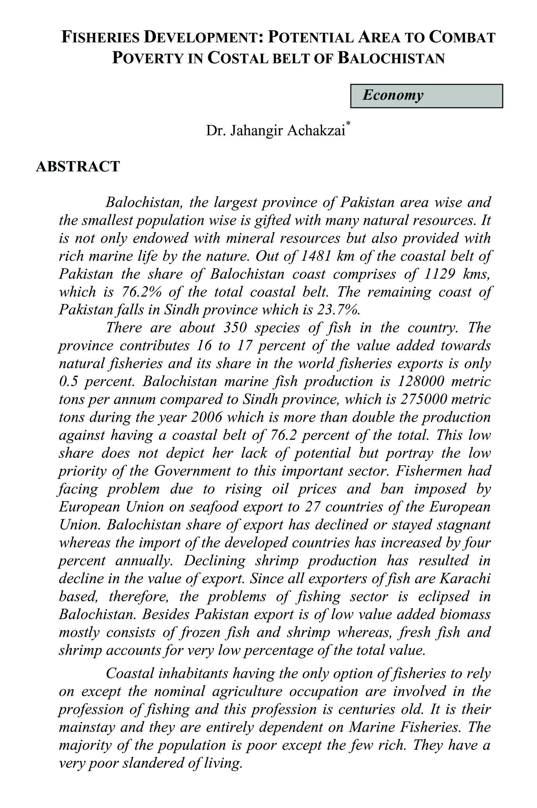 FISHERIES DEVELOPMENT: POTENTIAL AREA TO COMBAT POVERTY IN COSTAL BELT OF BALOCHISTAN (abstract)