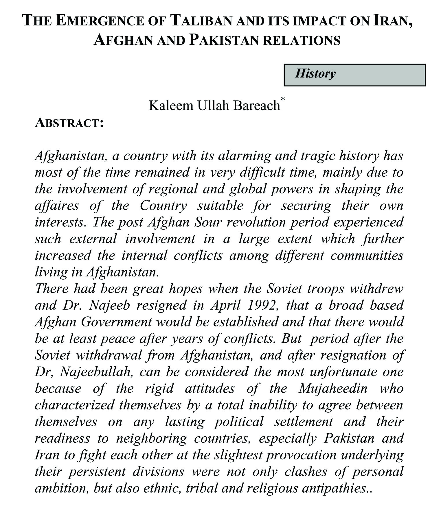 THE EMERGENCE OF TALIBAN AND ITS IMPACT ON IRAN, AFGHAN AND PAKISTAN RELATIONS (abstract)