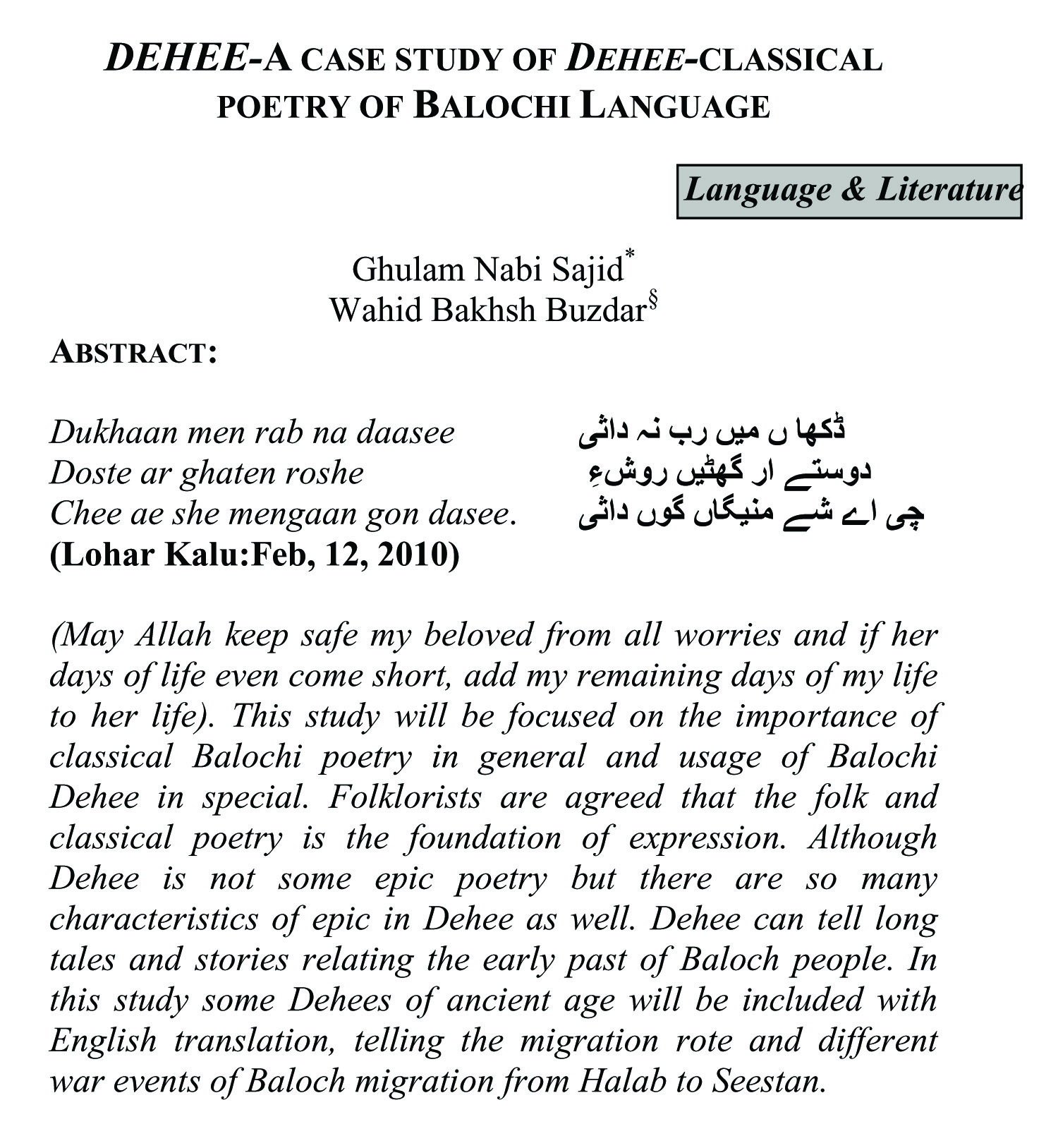 DEHEE-A CASE STUDY OF DEHEE-CLASSICAL POETRY OF BALOCHI LANGUAGE (abstract)