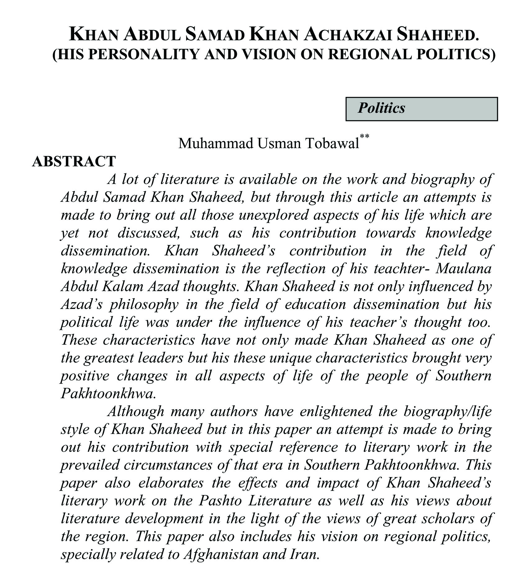 KHAN ABDUL SAMAD KHAN ACHAKZAI SHAHEED.(HIS PERSONALITY AND VISION ON REGIONAL POLITICS) (abstract)