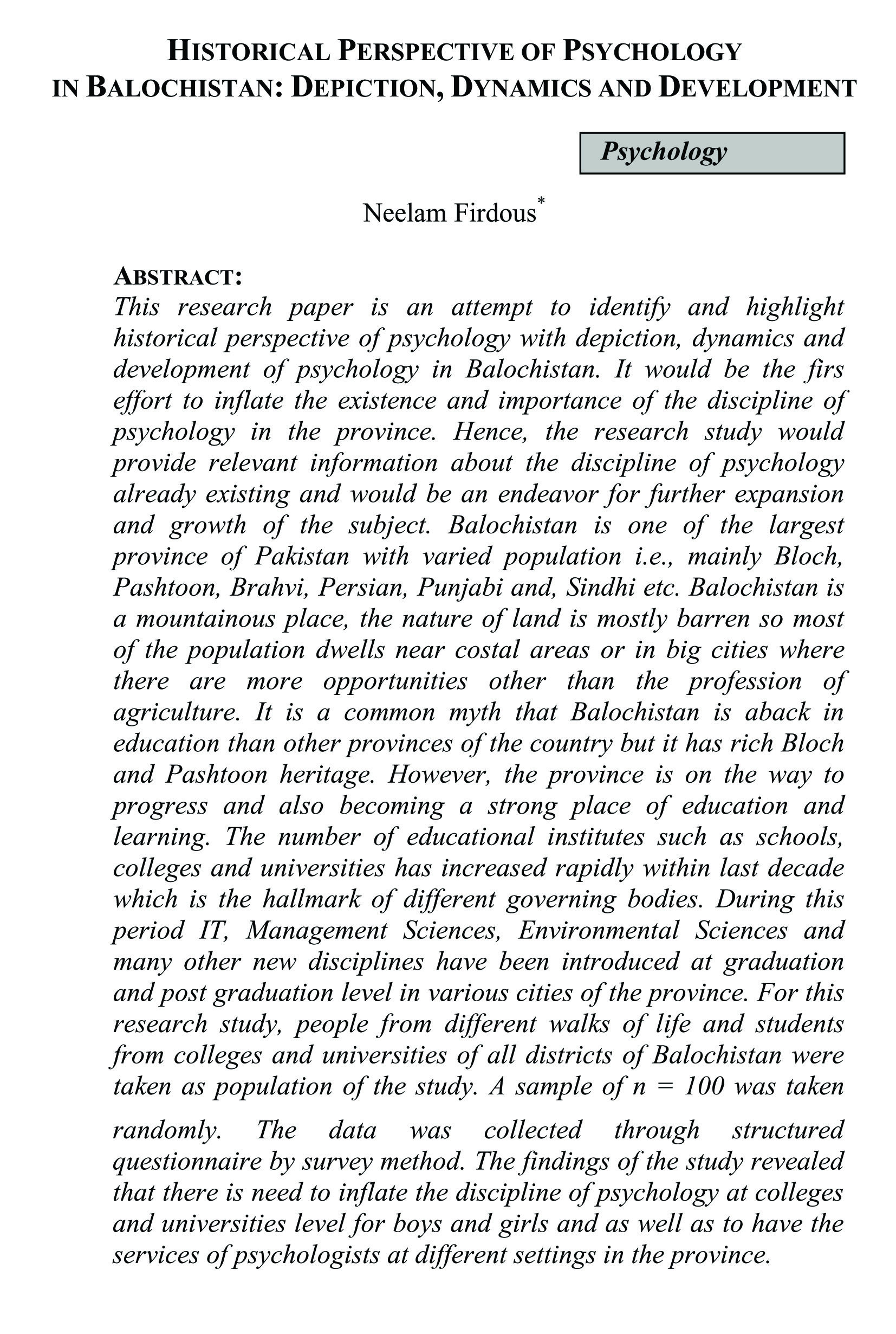 HISTORICAL PERSPECTIVE OF PSYCHOLOGY IN BALOCHISTAN: DEPICTION, DYNAMICS AND DEVELOPMENT(abstract)