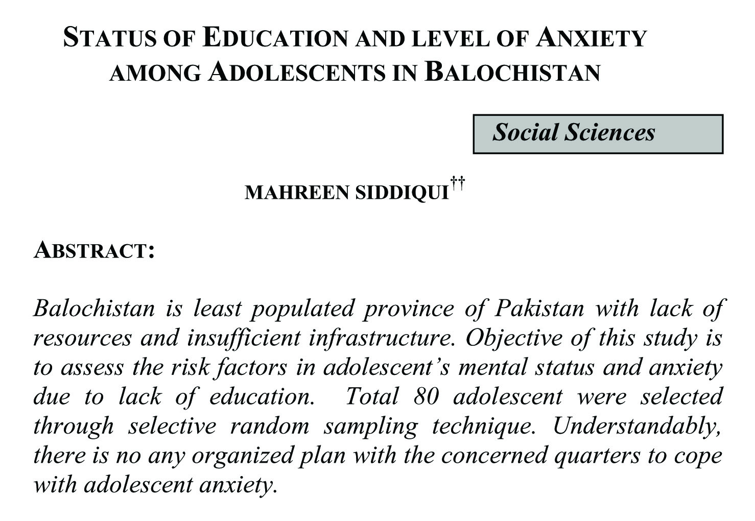 STATUS OF EDUCATION AND LEVEL OF ANXIETY AMONG ADOLESCENTS IN BALOCHISTAN (abstract)
