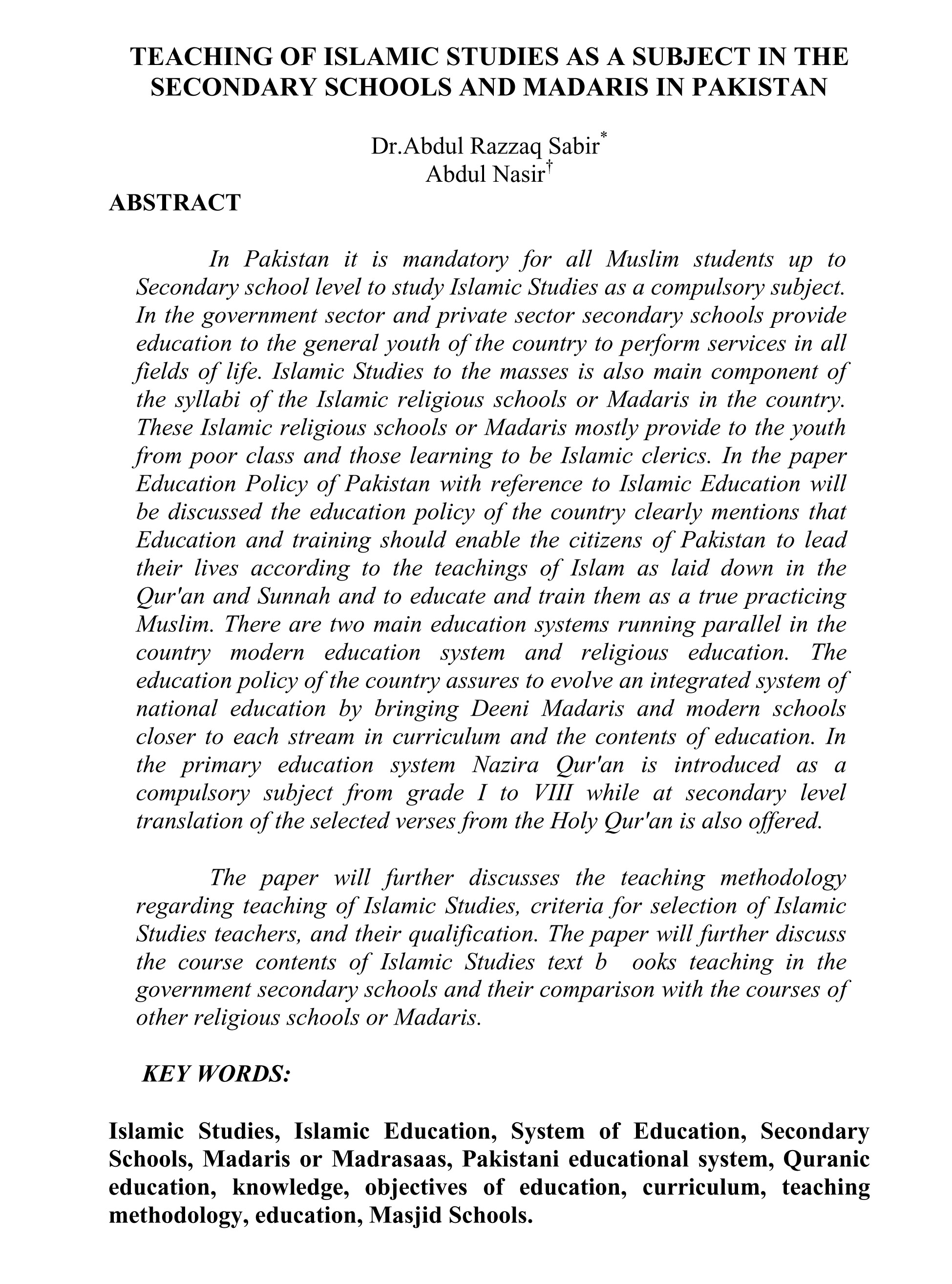 TEACHING OF ISLAMIC STUDIES AS A SUBJECT IN THE SECONDARY SCHOOLS AND MADARIS IN PAKISTAN (abstract)