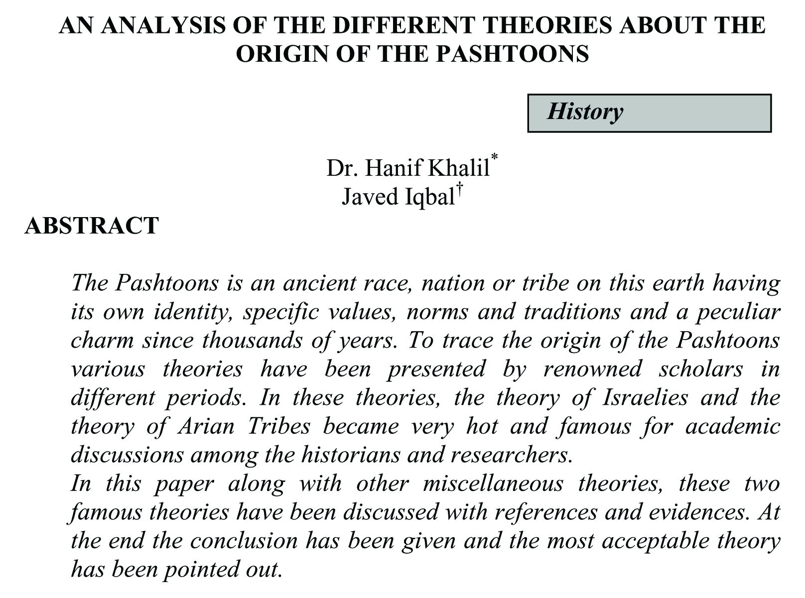 AN ANALYSIS OF THE DIFFERENT THEORIES ABOUT THE ORIGIN OF THE PASHTOONS (abstract)