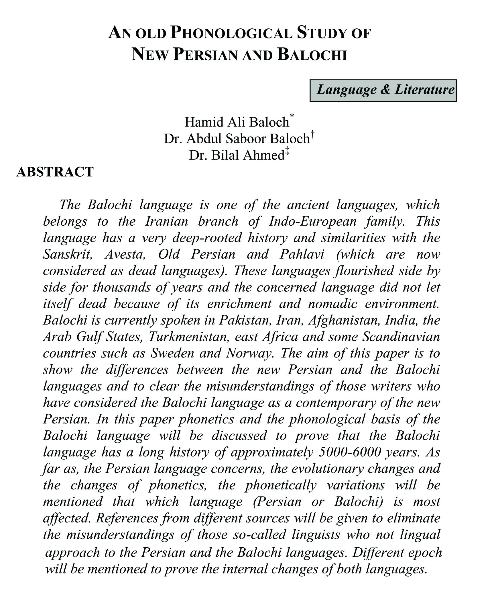 AN OLD PHONOLOGICAL STUDY OF NEW PERSIAN AND BALOCHI (abstract)
