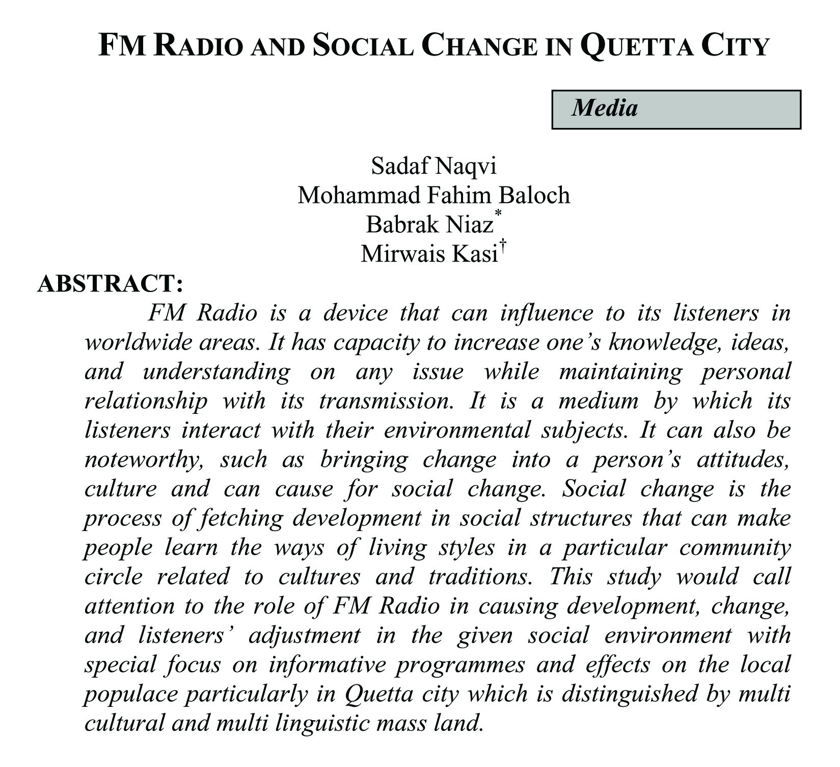 FM RADIO AND SOCIAL CHANGE IN QUETTA CITY (abstract)