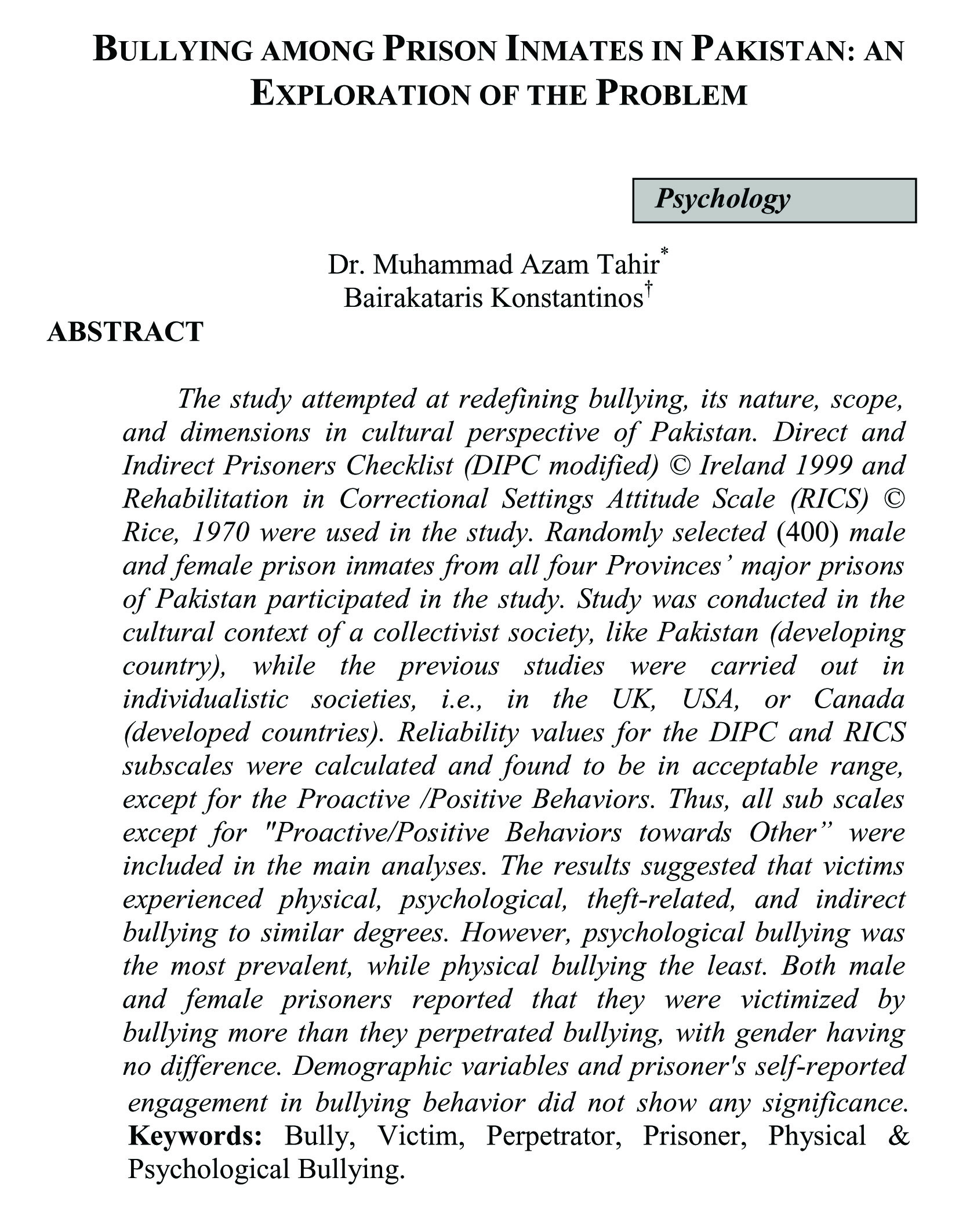 BULLYING AMONG PRISON INMATES IN PAKISTAN: AN EXPLORATION OF THE PROBLEM (abstract)