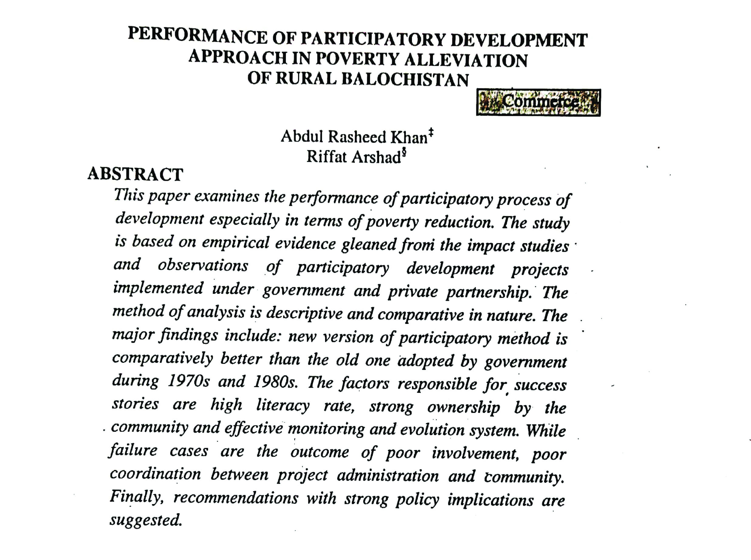PERFORMANCE OF PARTICIPATORY DEVELOPMENT APPROACH IN POVERTY ALLEVIATION OF RURAL BALOCHISTAN (abstract)