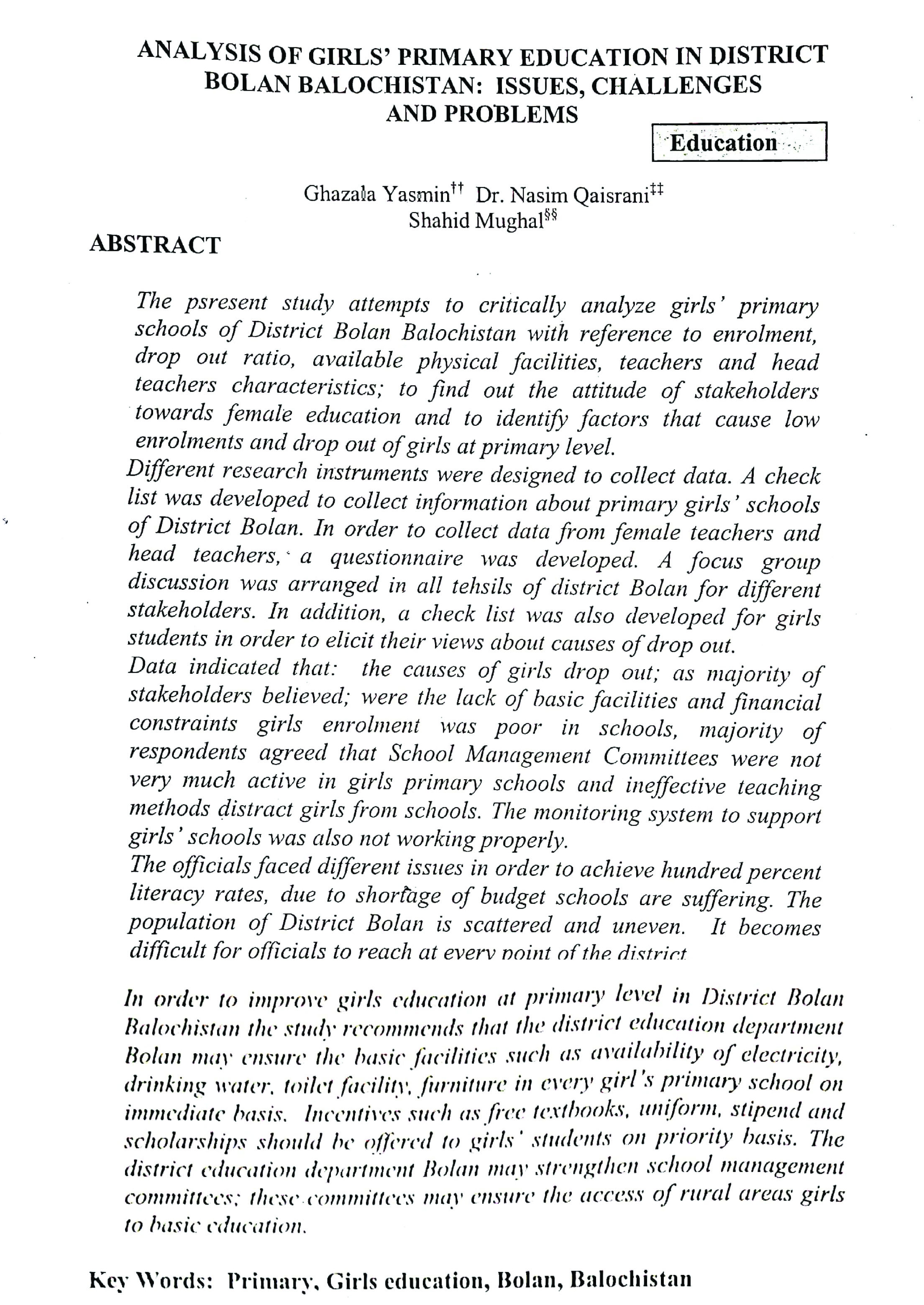 PRIMARY EDUCATION IN DISTRICT BOLAN BALOCHISTAN: ISSUES, CHALLENGES