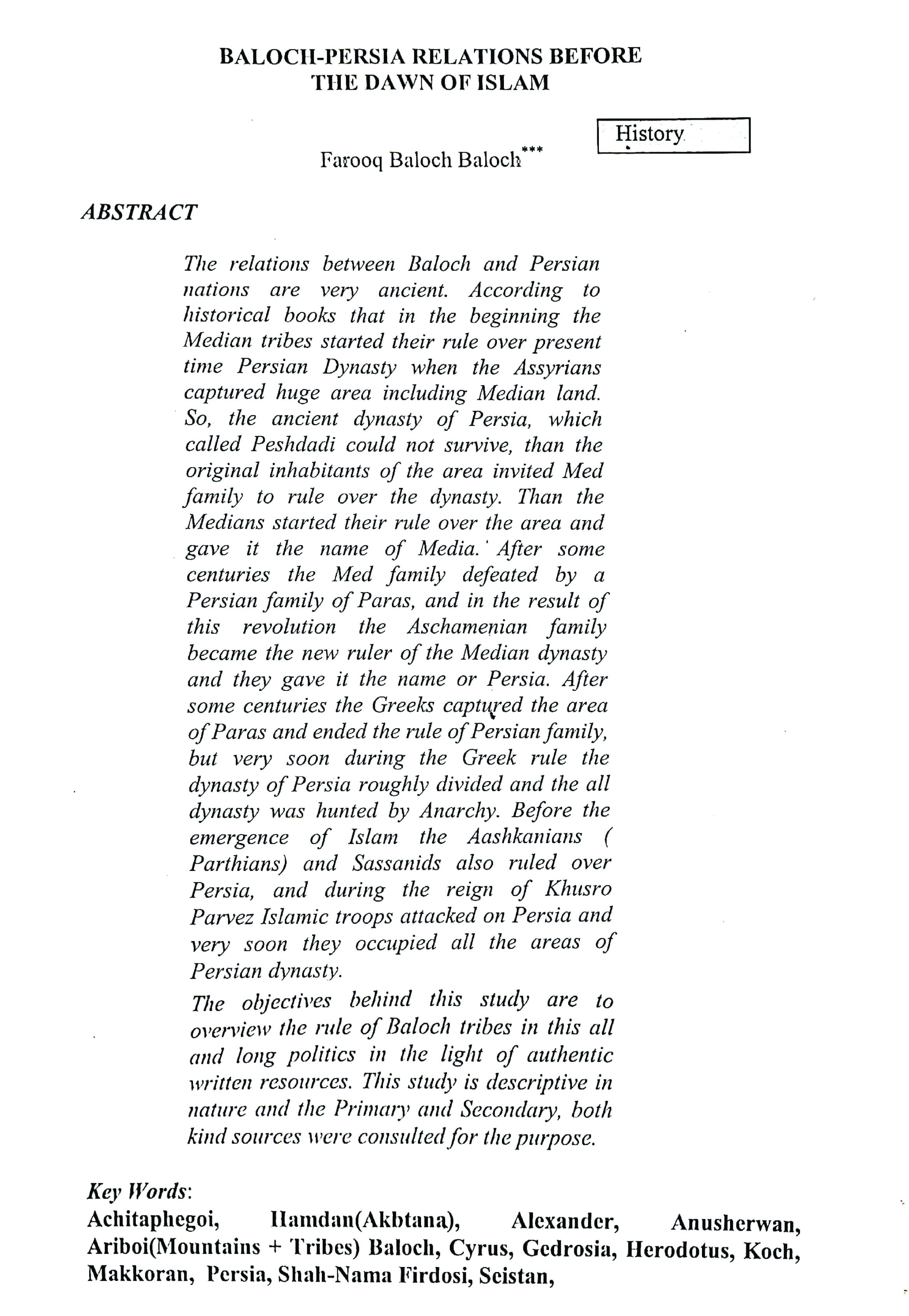 BALOCH-PERSIA RELATIONS BEFORE THE DAWN OF ISLAM (abstract)