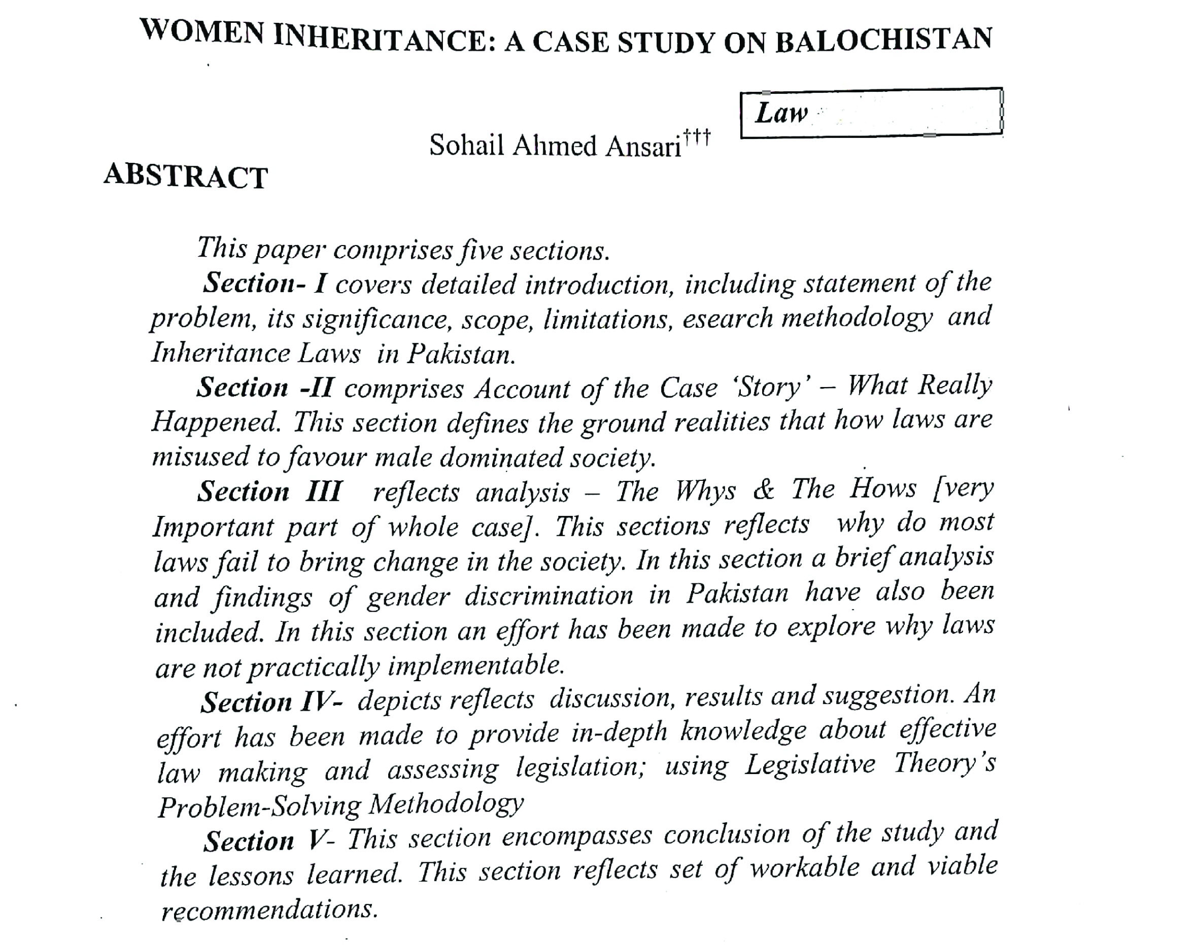 WOMEN INHERITANCE: A CASE STUDY ON BALOCHISTAN (abstract)