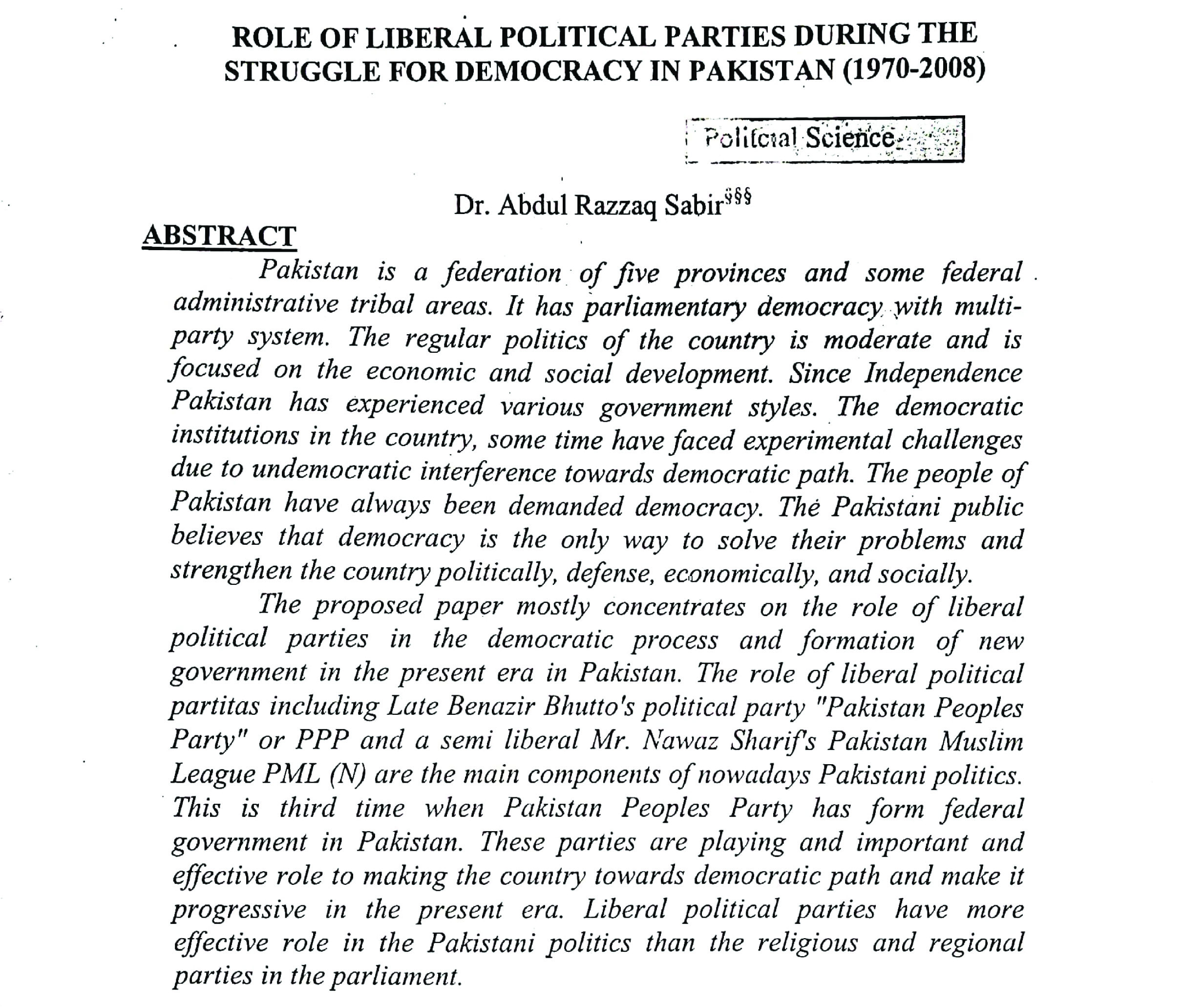 ROLE OF LIBERAL POLITICAL PARTIES DURING THE. STRUGGLE FOR DEMOCRACY IN PAKISTAN (1970-2008) (abstract)