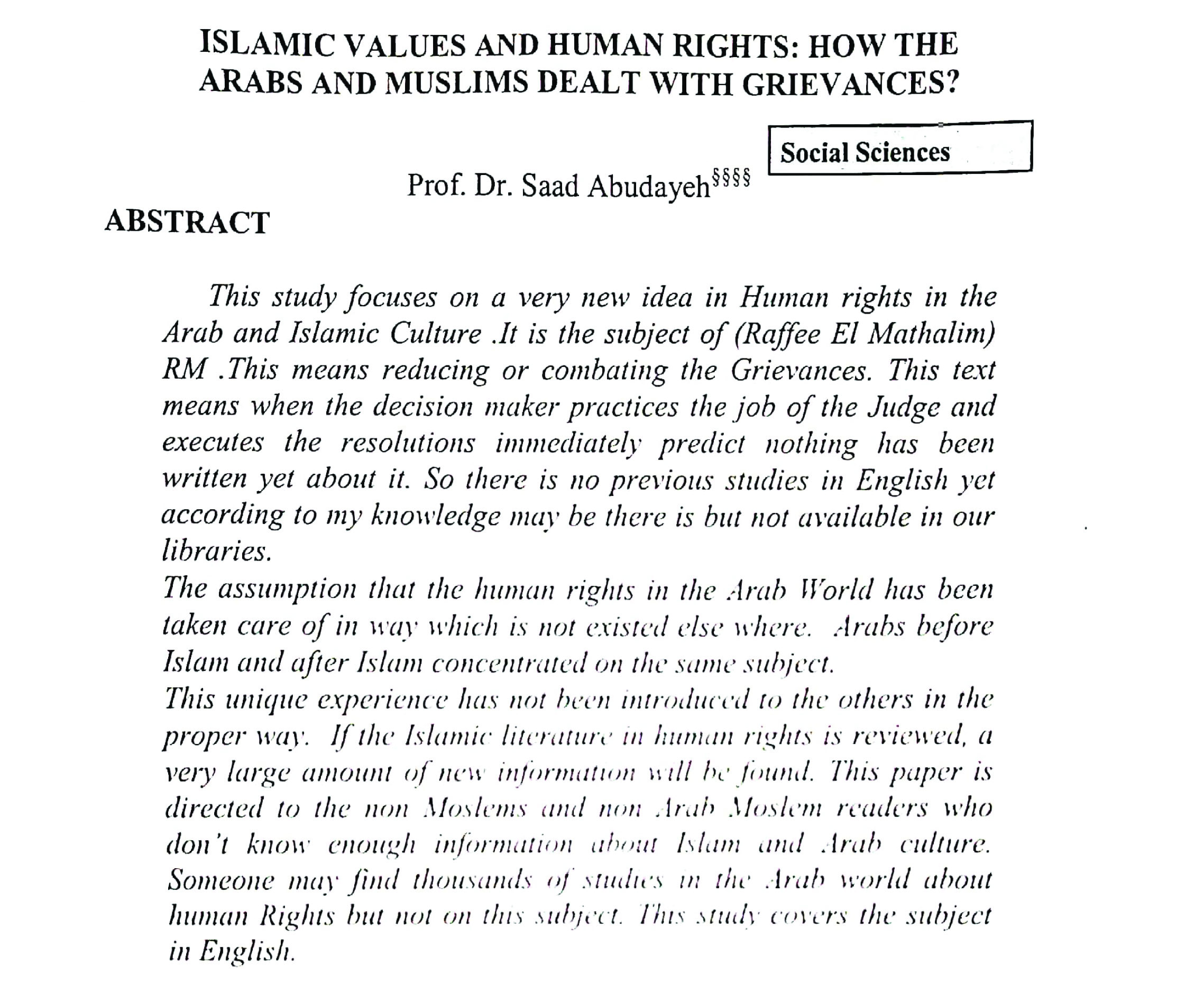 ISLAMIC VALUES AND HUMAN RIGHTS: HOW THE ARABS AND MUSLIMS DEALT WITH GRIEVANCES? (abstract)