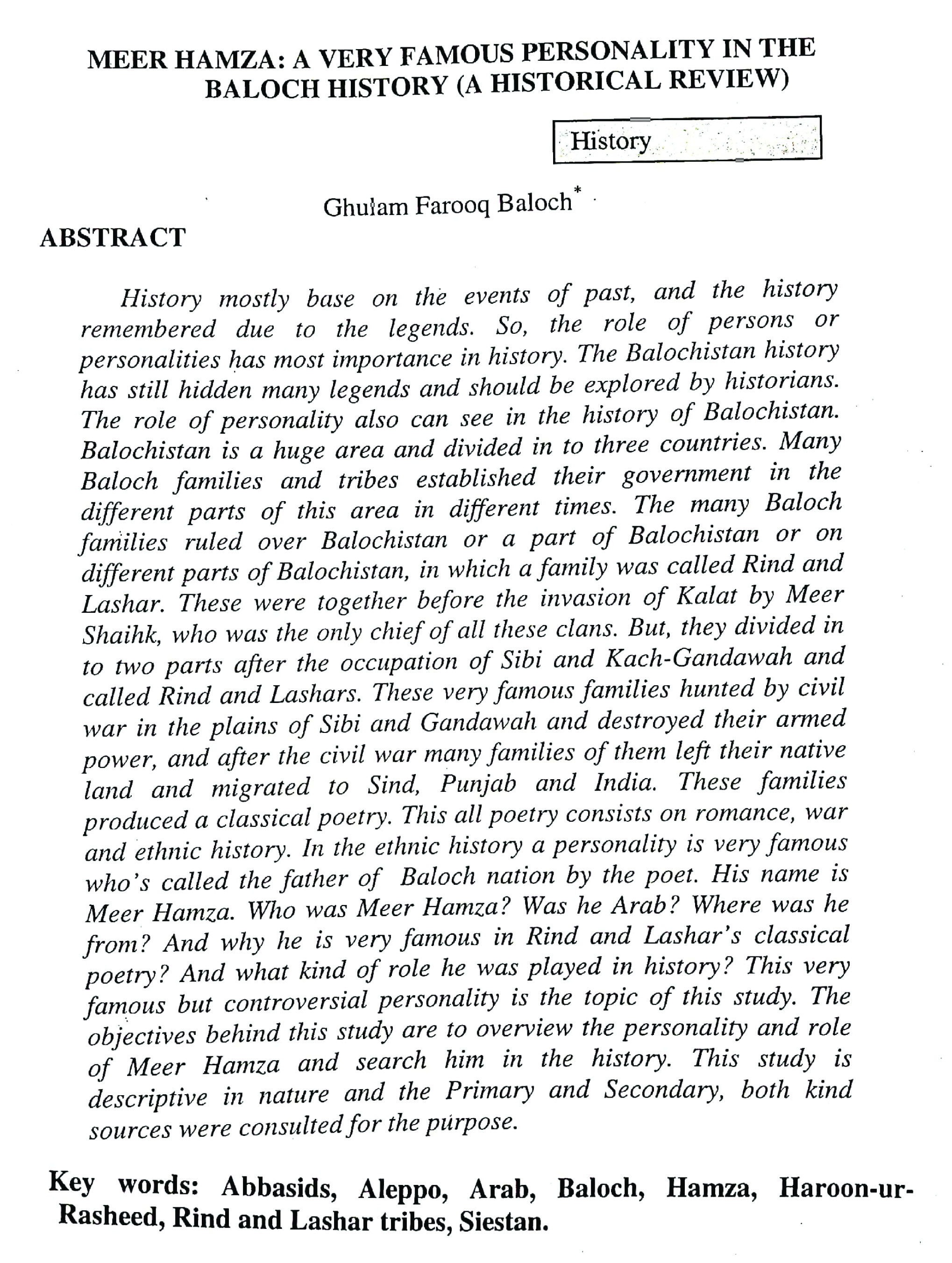 MEER HAMZA: A VERY FAMOUS PERSONALITY IN THE BALOCH HISTORY (A HISTORICAL REVIEW)(abstract)