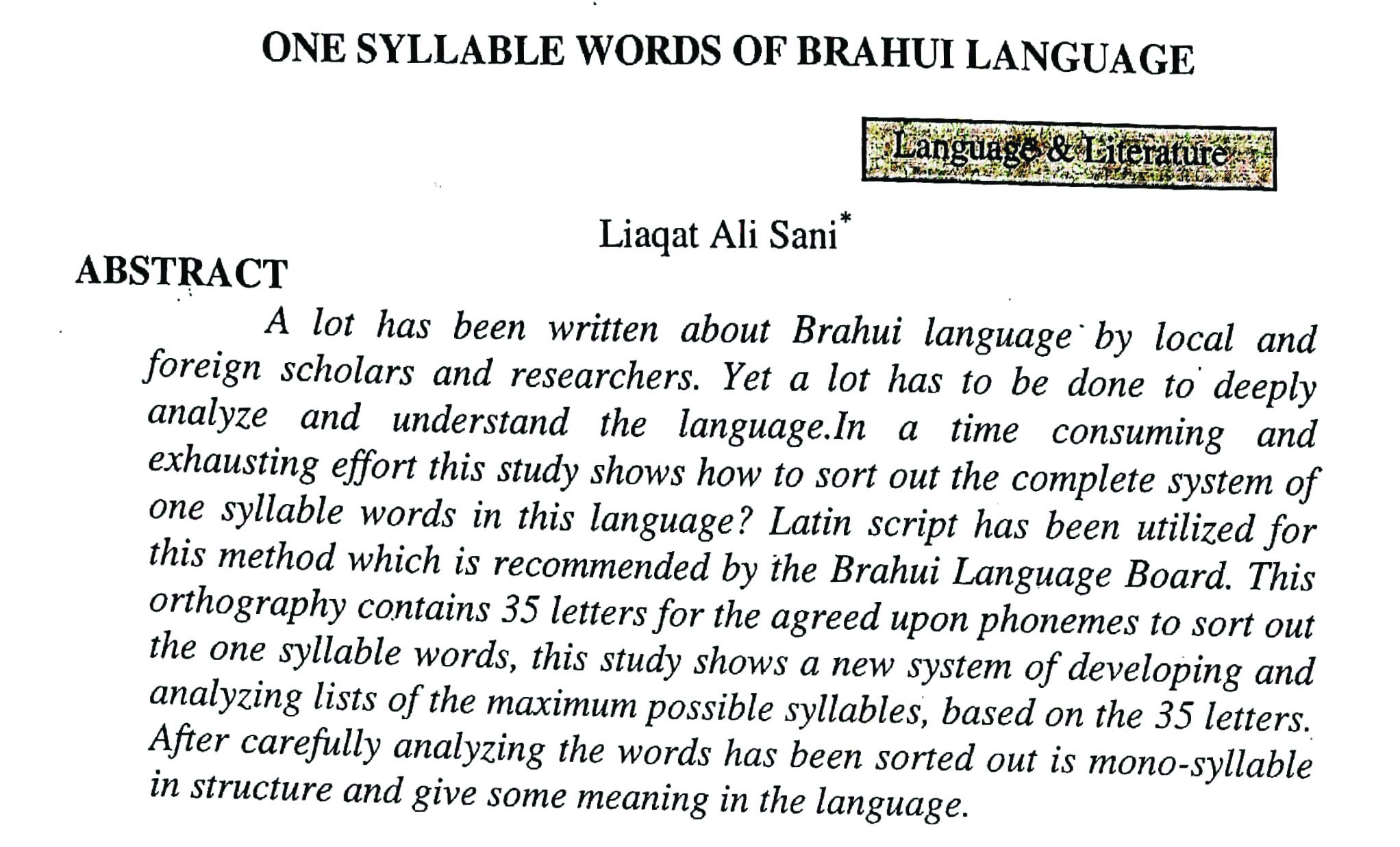 ONE SYLLABLE WORDS OF BRAHUI LANGUAGE (abstract)