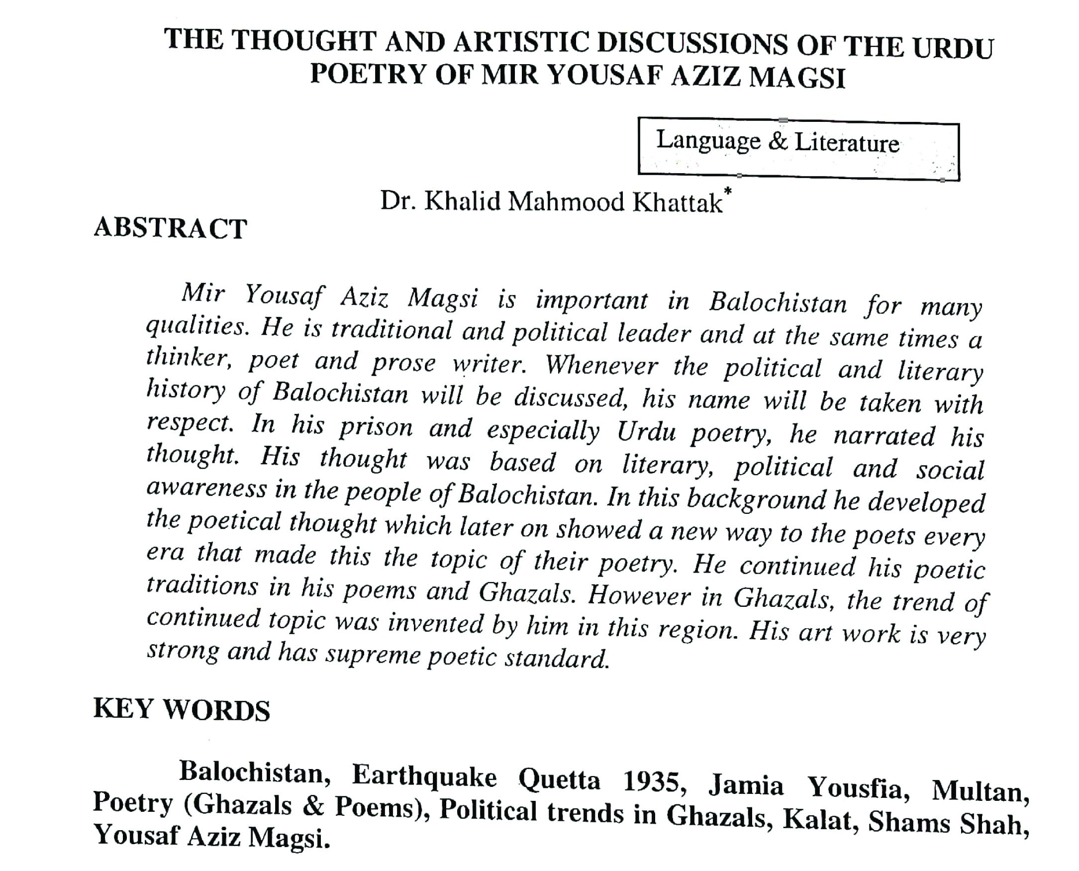 THE THOUGHT AND ARTISTIC DISCUSSIONS OF THE URDU POETRY OF MIR YOUSAF AZIZ MAGSI (abstract)