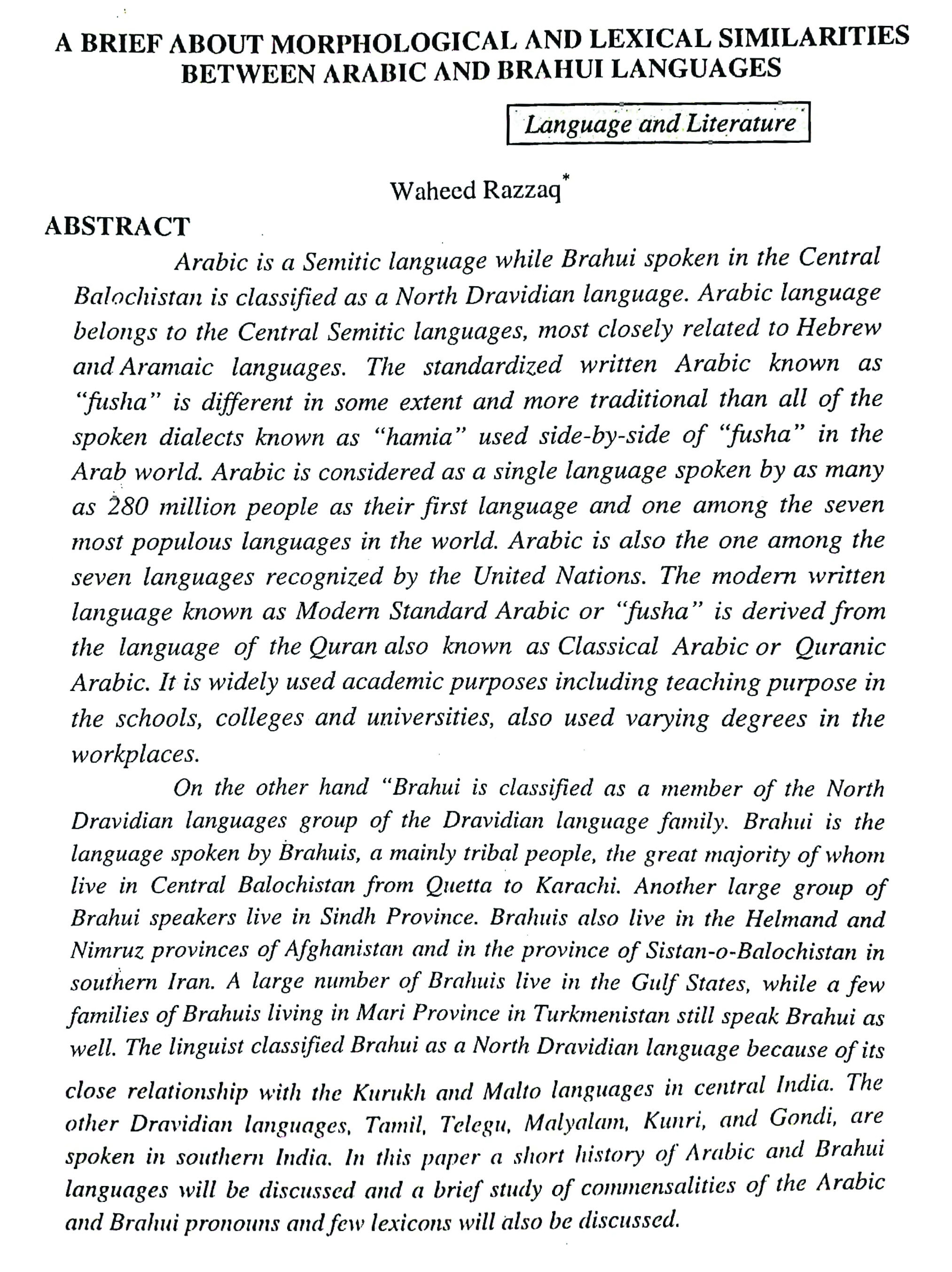 A BRIEF ABOUT MORPHOLOGICAL AND LEXICAL SIMILARITIES BETWEEN ARABIC AND BRAHUI LANGUAGES (abstract)