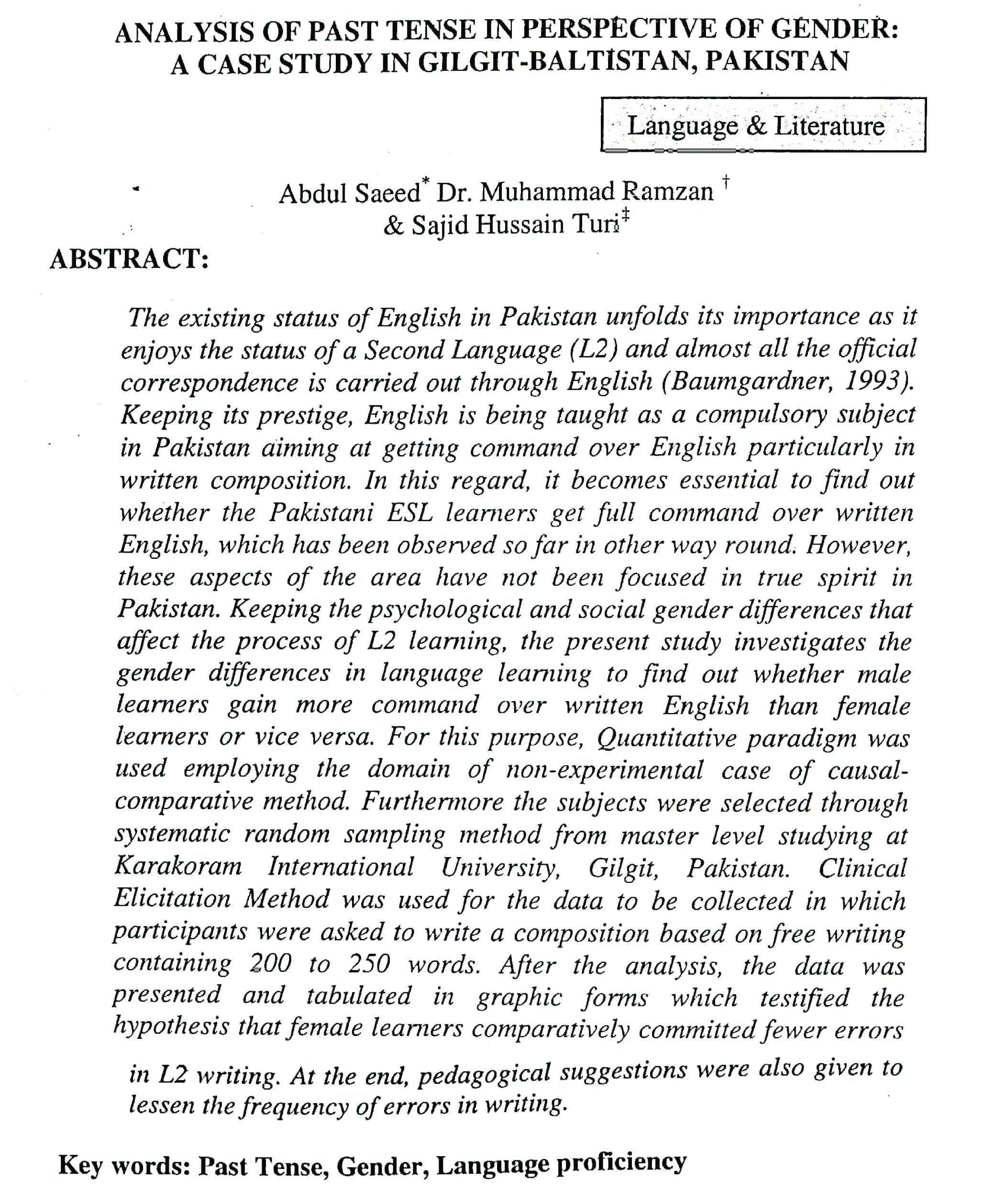 ANALYSIS OF PAST TENSE IN PERSPECTIVE OF GENDER: A CASE STUDY IN GILGIT-BALTISTAN, PAKISTAN (abstract)