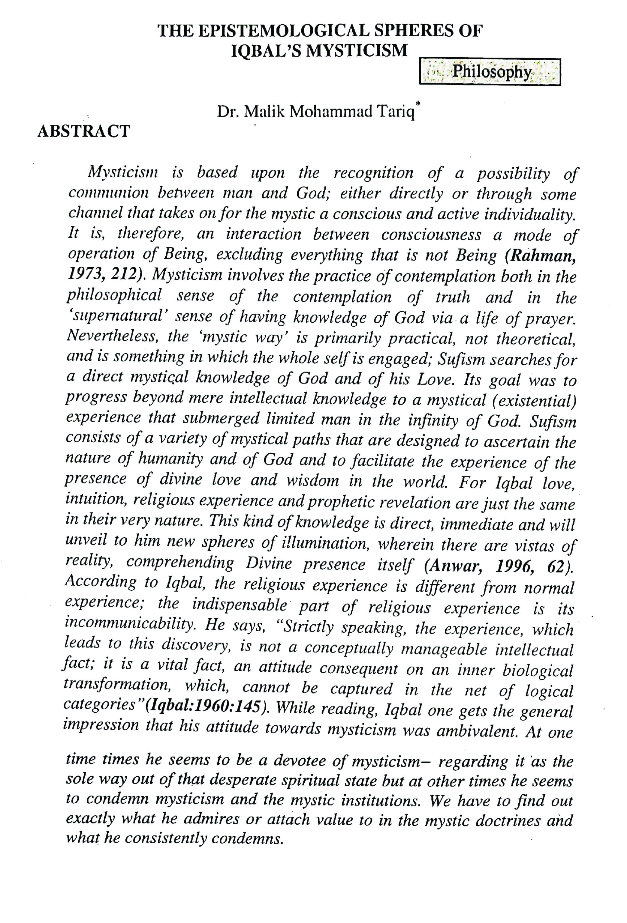 THE EPISTEMOLOGICAL SPHERES OF IQBAL'S MYSTICISM (abstract)