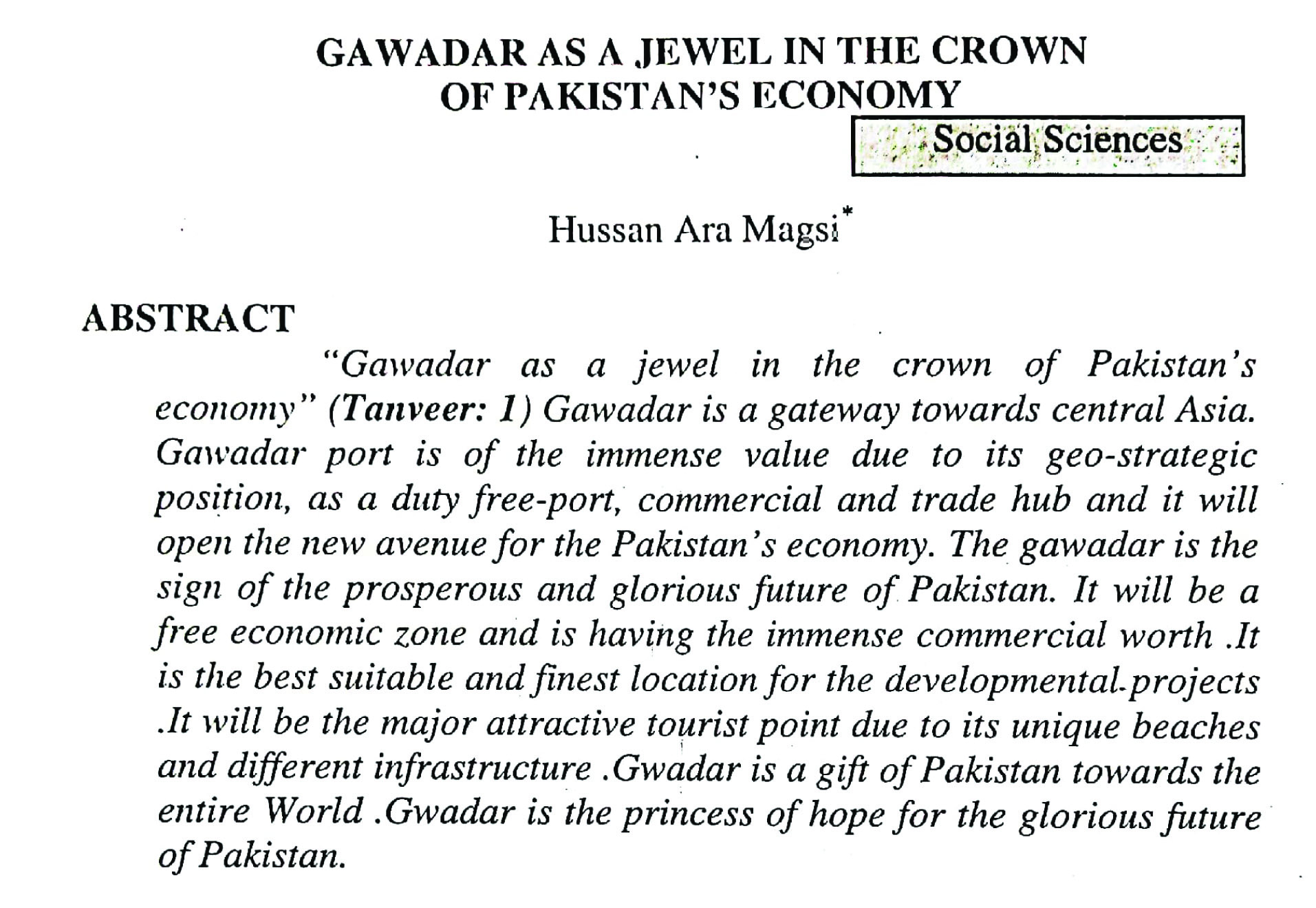 GAWADAR AS A JEWEL IN THE CROWN OF PAKISTAN'S ECONOMY (abstract)