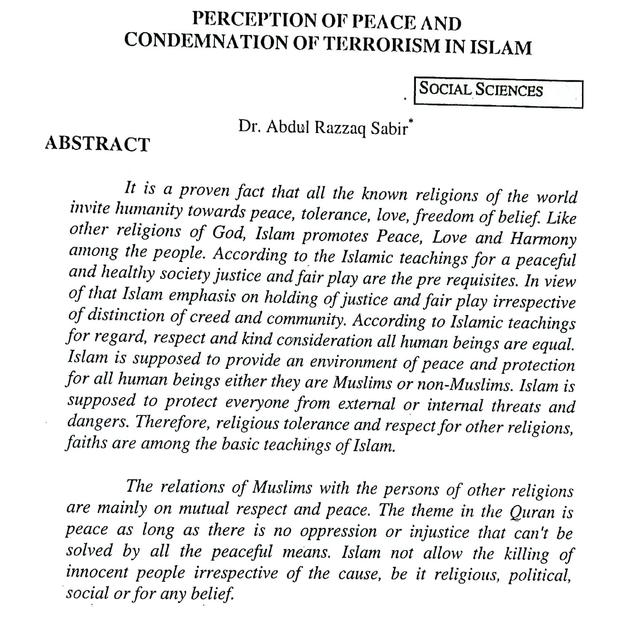 PERCEPTION OP PEACE AND CONDEMNATION OF TERRORISM IN ISLAM (abstract)