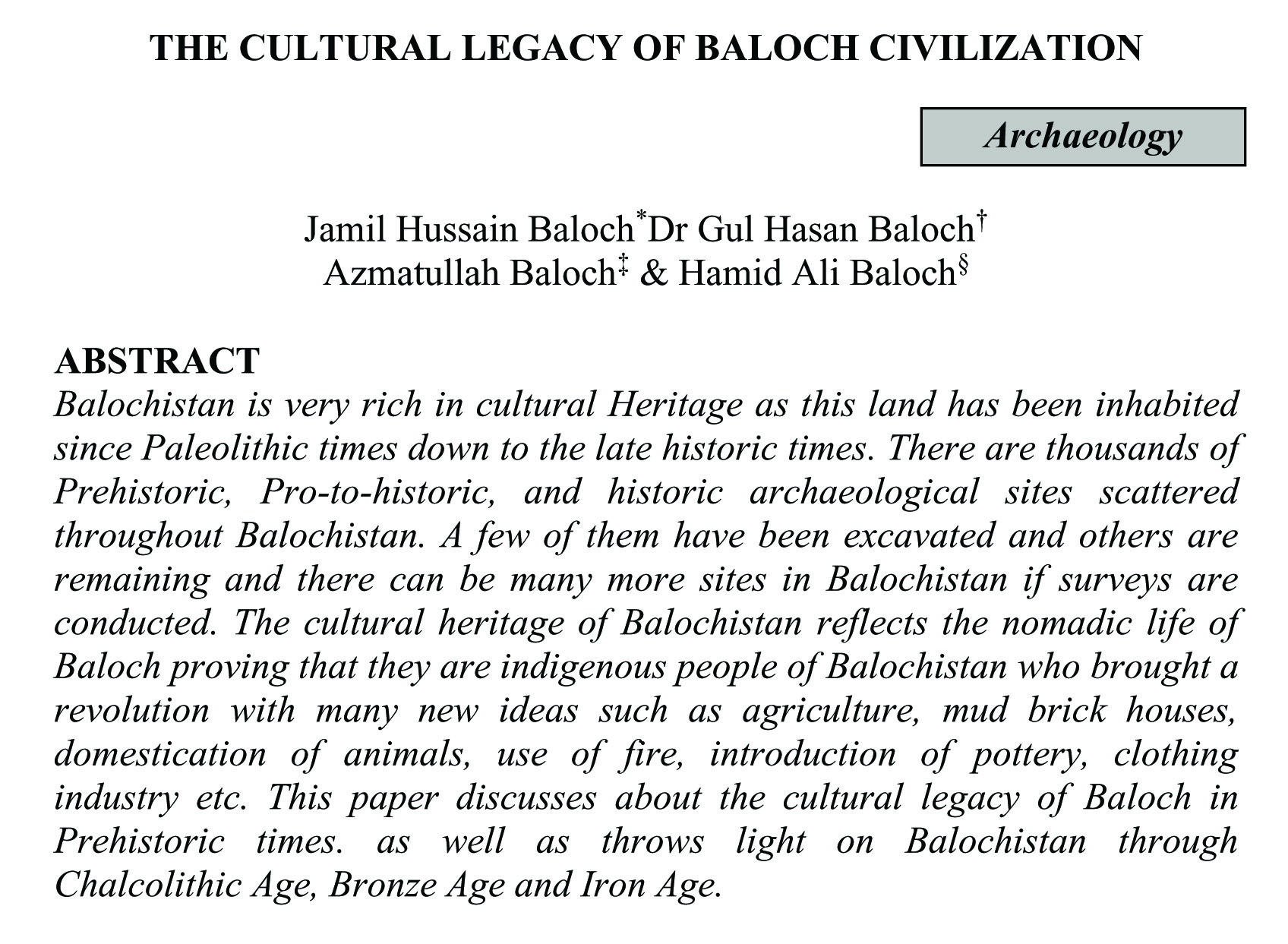 THE CULTURAL LEGACY OF BALOCH CIVILIZATION (abstract)