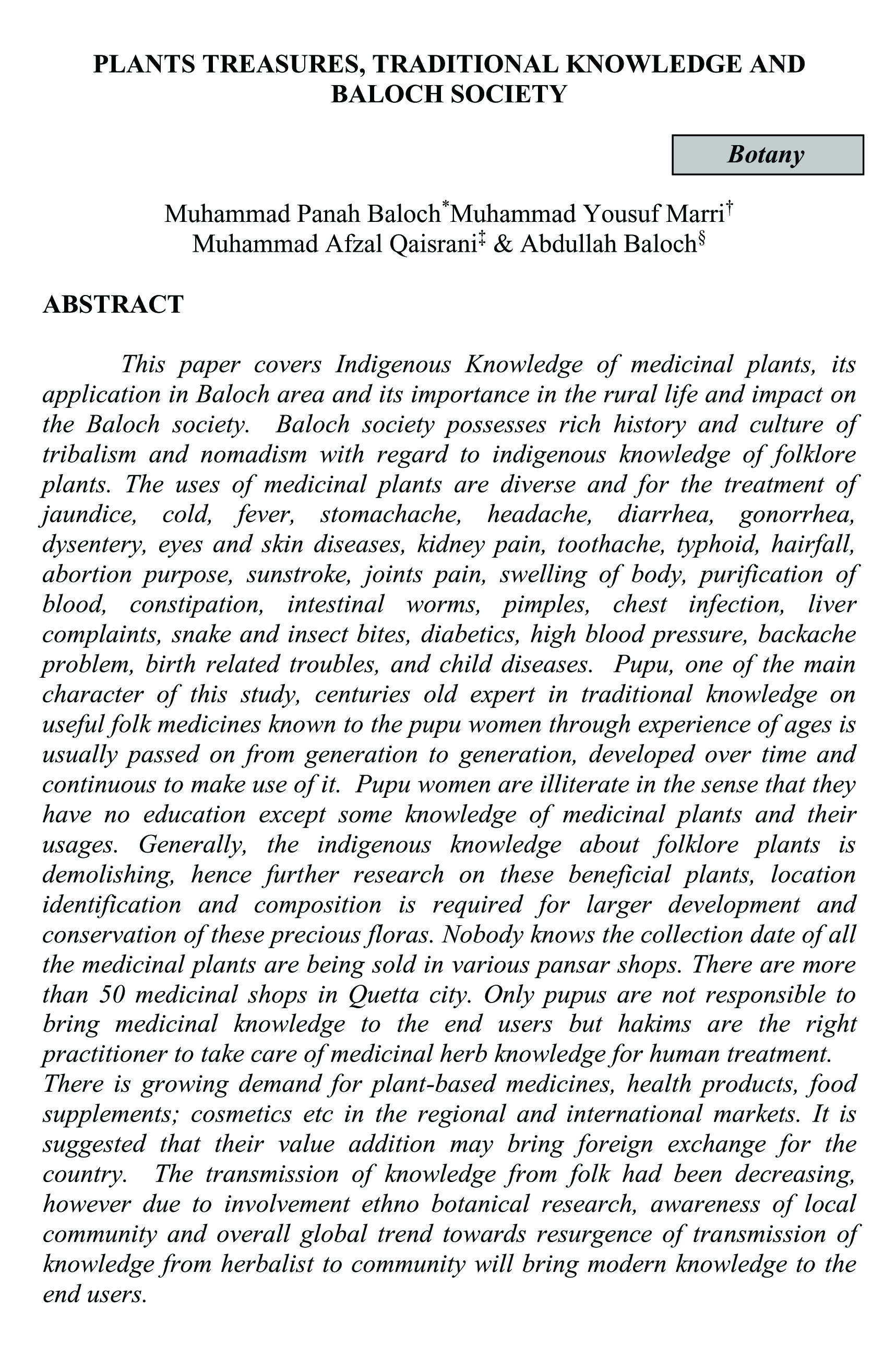 PLANTS TREASURES, TRADITIONAL KNOWLEDGE AND BALOCH SOCIETY (abstract)