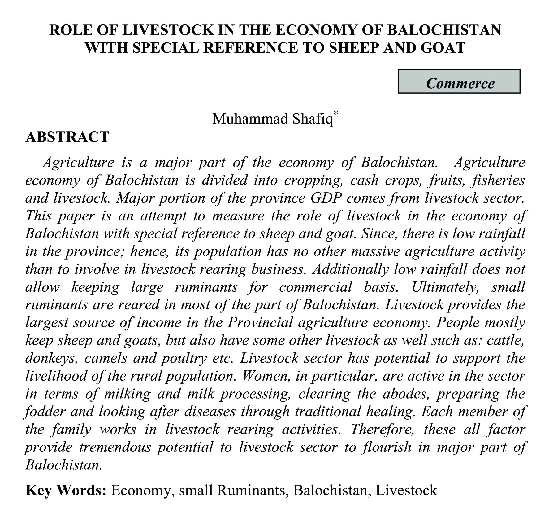ROLE OF LIVESTOCK IN THE ECONOMY OF BALOCHISTAN WITH SPECIAL REFERENCE TO SHEEP AND GOAT (abstract)