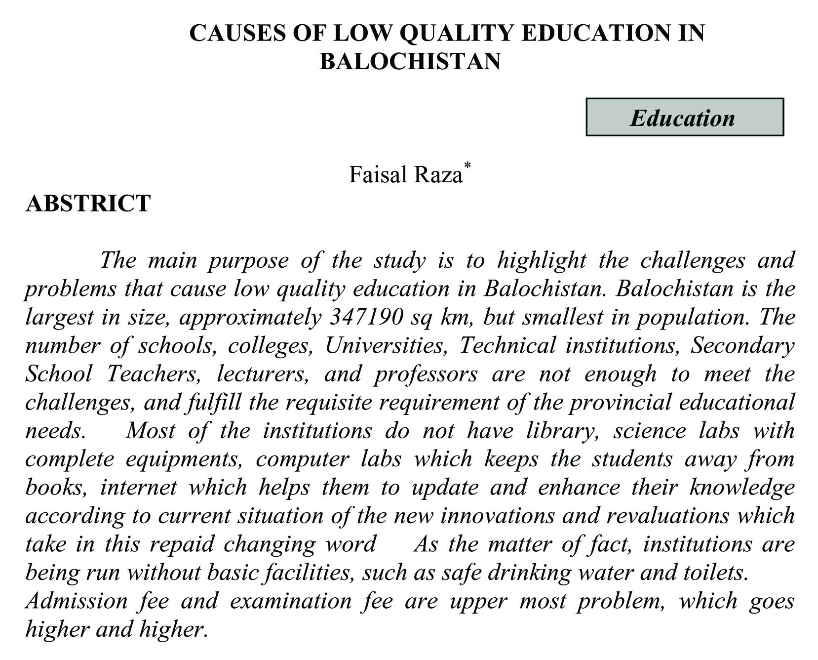 CAUSES OF LOW QUALITY EDUCATION IN BALOCHISTAN (abstract)
