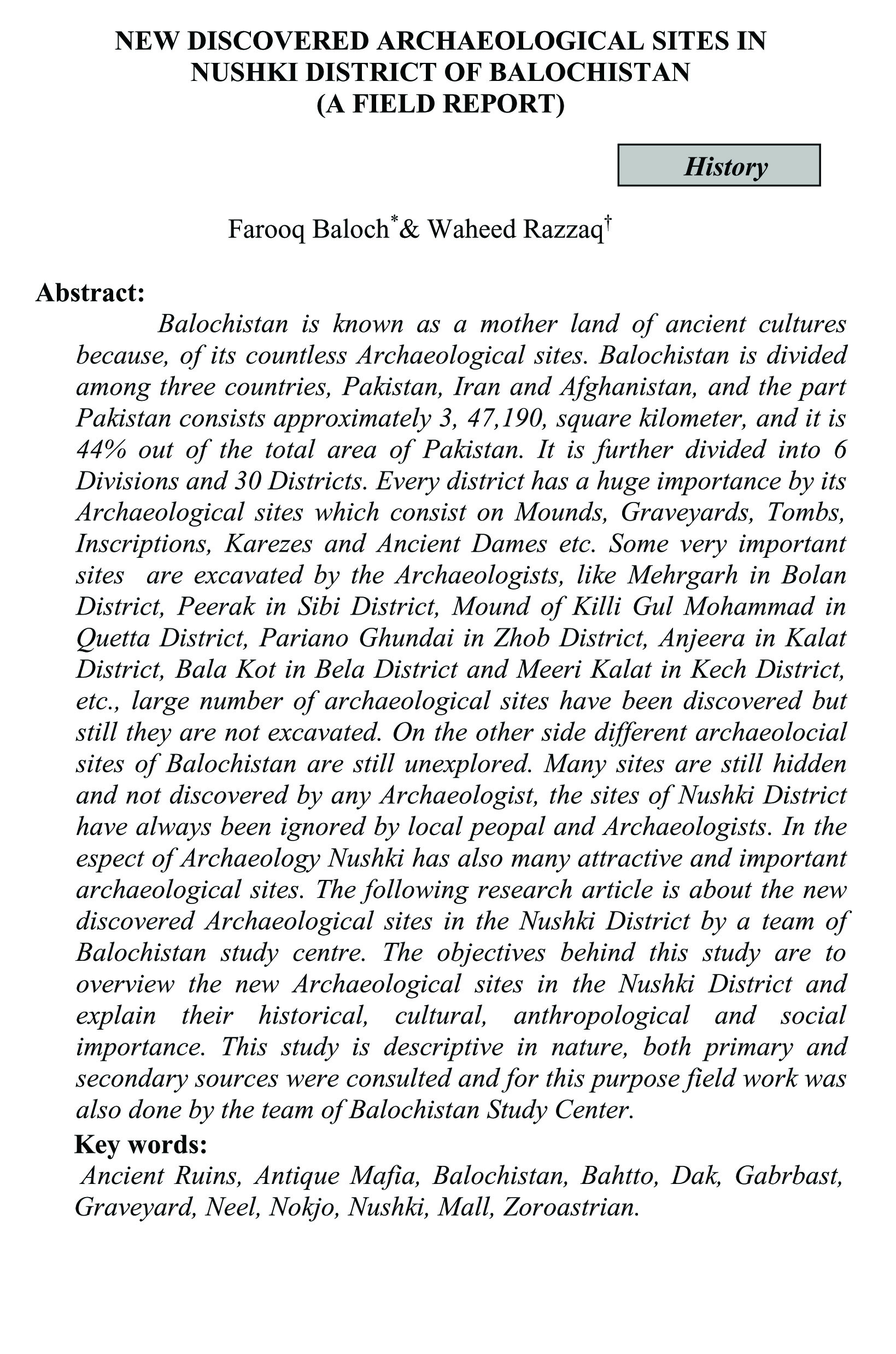 NEW DISCOVERED ARCHAEOLOGICAL SITES IN NUSHKI DISTRICT OF BALOCHISTAN (A FIELD REPORT) (abstract)