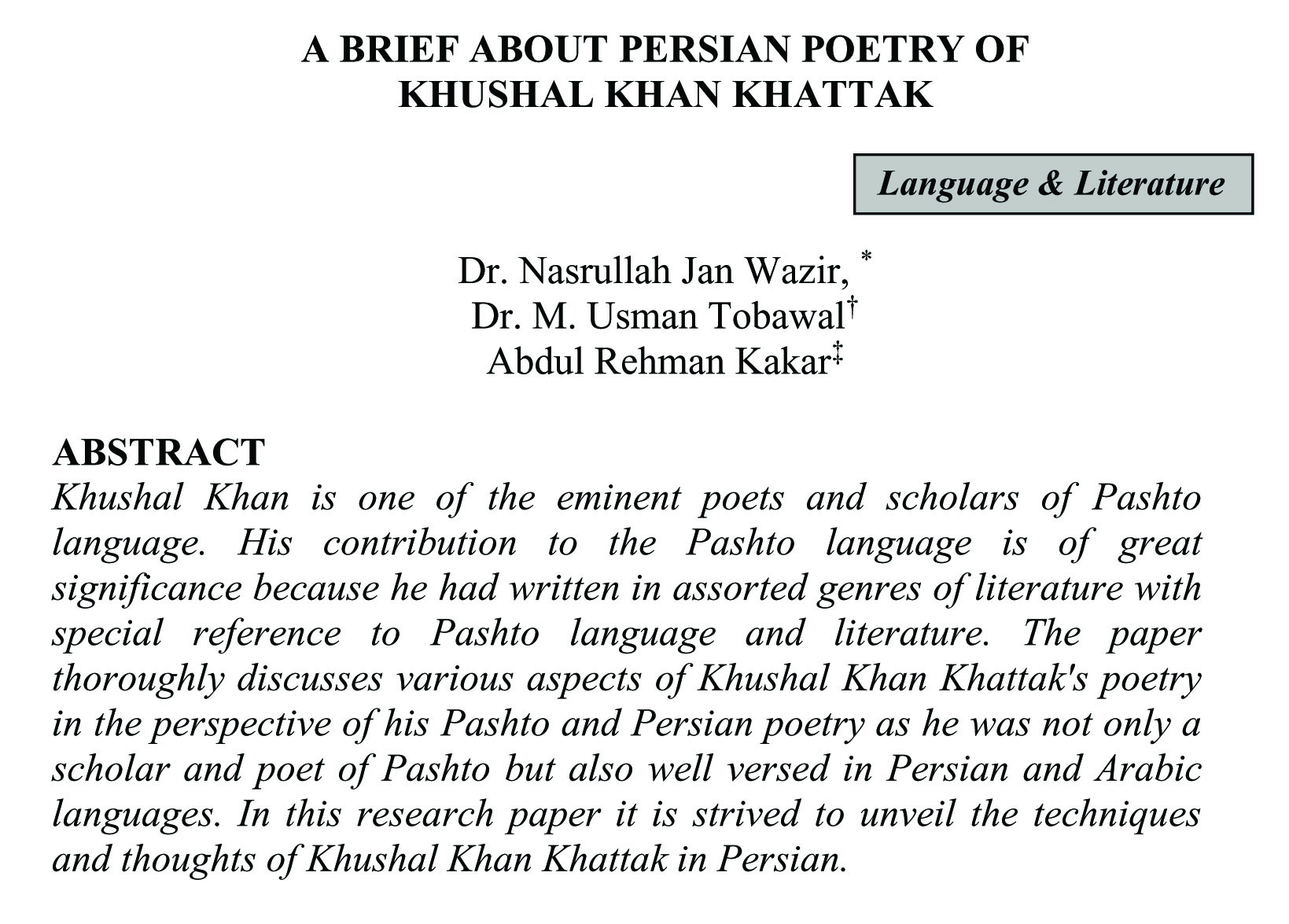A BRIEF ABOUT PERSIAN POETRY OF KHUSHAL KHAN KHATTAK (abstract)