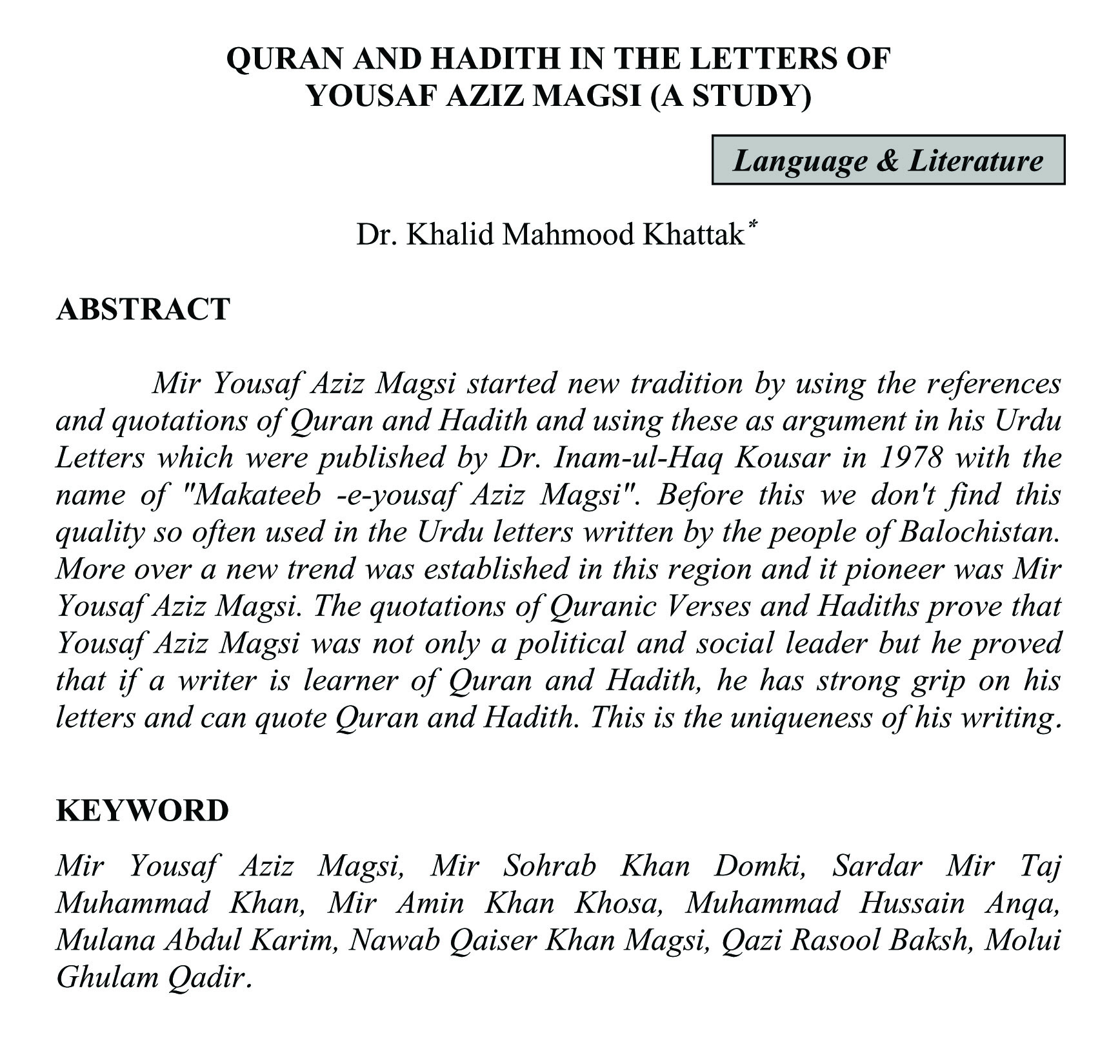 QURAN AND HADITH IN THE LETTERS OF YOUSAF AZIZ MAGSI (A STUDY) (abstract)
