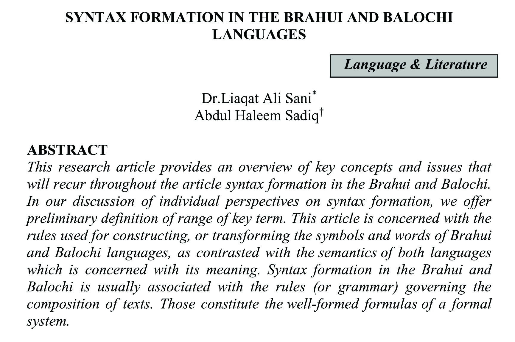 SYNTAX FORMATION IN THE BRAHUI AND BALOCHI LANGUAGES (abstract)