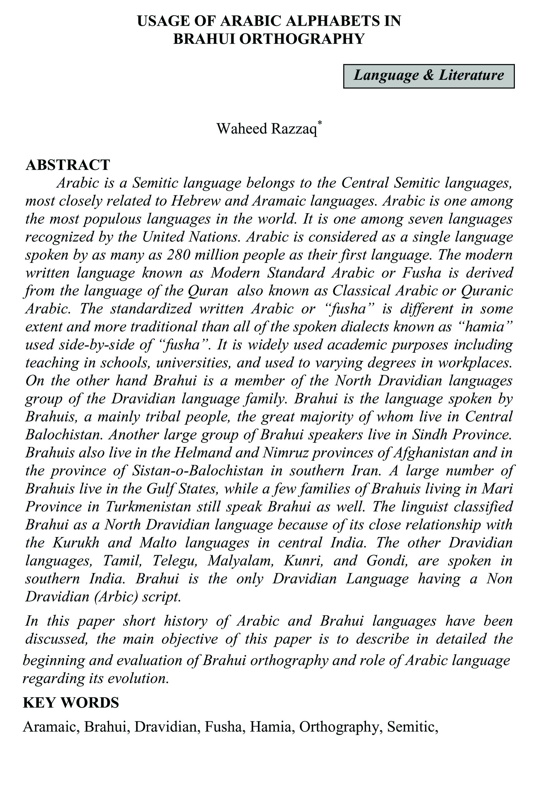USAGE OF ARABIC ALPHABETS IN BRAHUI ORTHOGRAPHY (abstract)