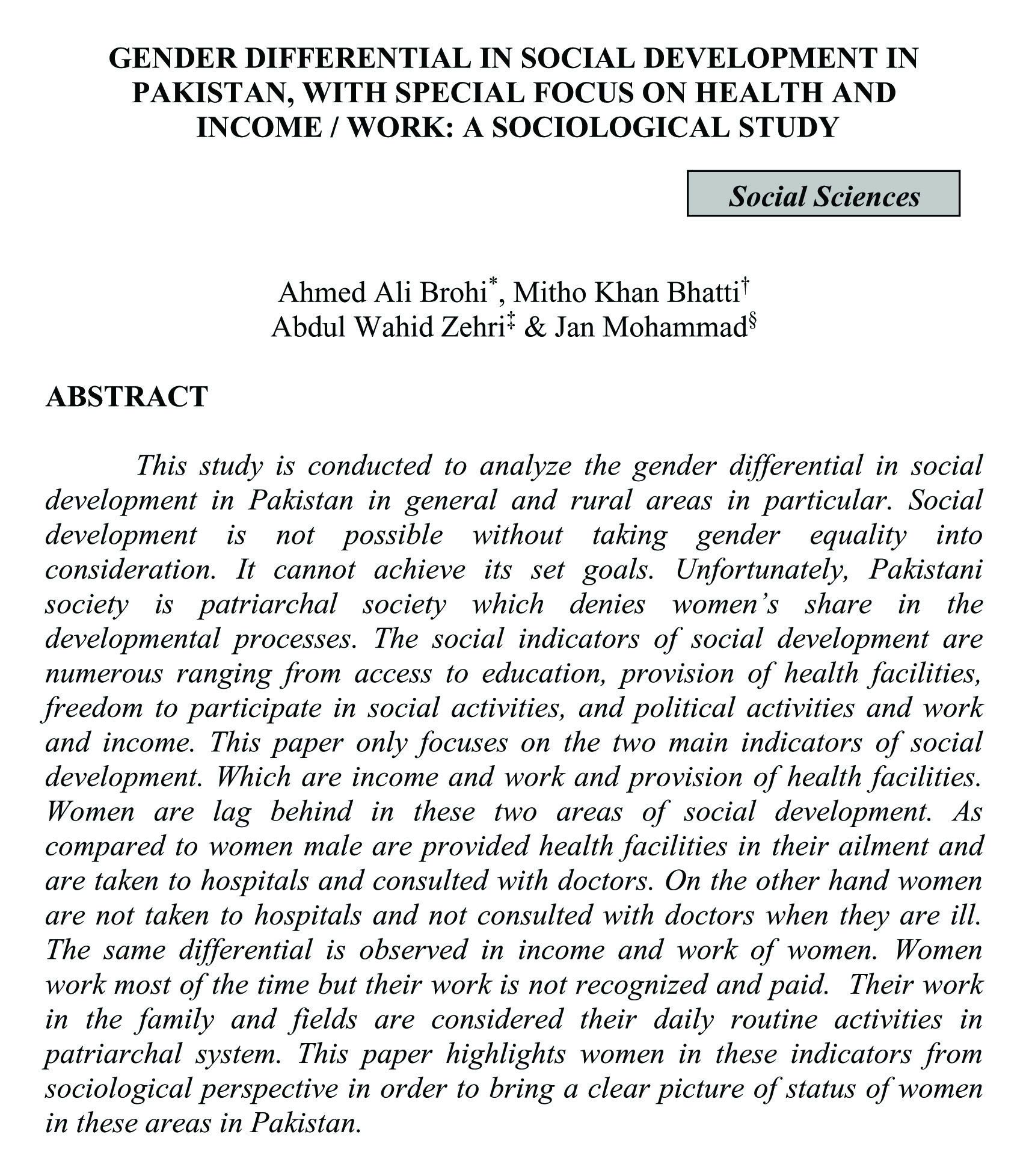 GENDER DIFFERENTIAL IN SOCIAL DEVELOPMENT IN PAKISTAN, WITH SPECIAL FOCUS ON HEALTH AND INCOME / WORK: A SOCIOLOGICAL STUDY (abstract)