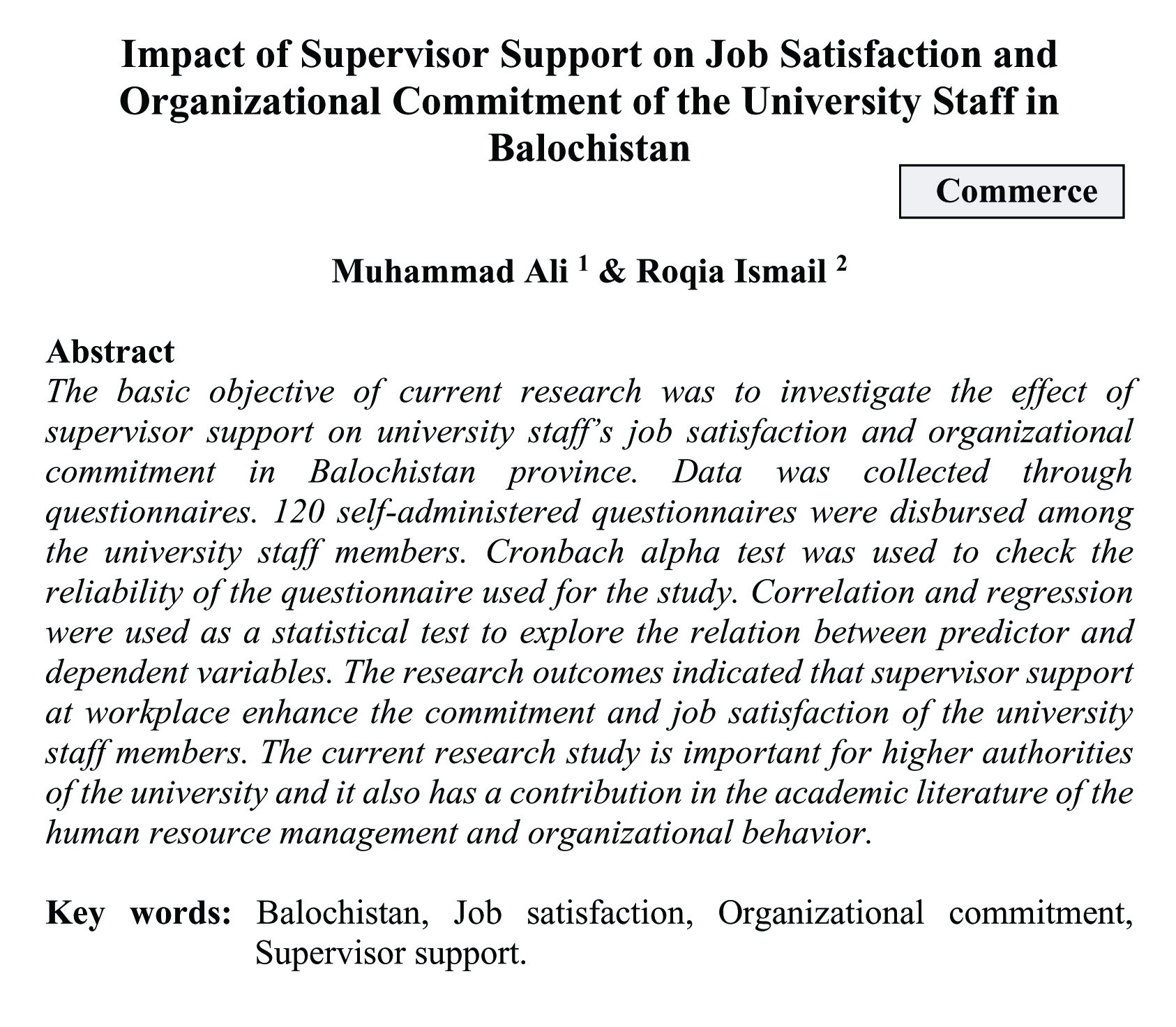 Impact of Supervisor Support on Job Satisfaction and Organizational Commitment of the University Staff in Balochistan (abstract)