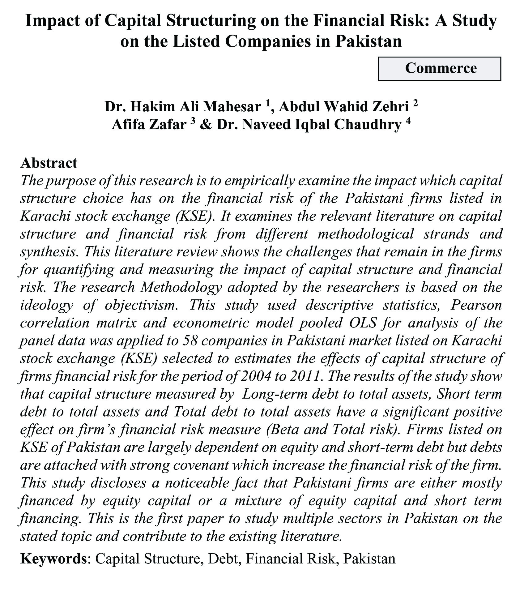Impact of Capital Structuring on the Financial Risk: A Study on the Listed Companies in Pakistan (abstract)