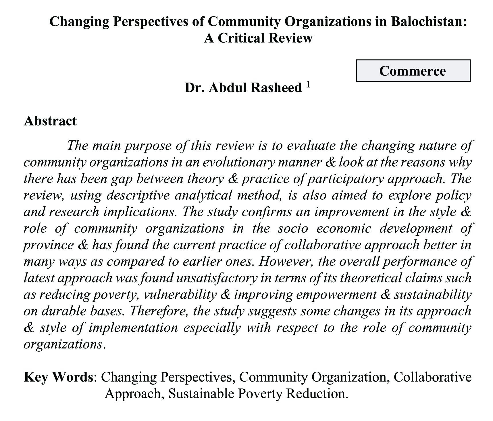 Changing Perspectives of Community Organizations in Balochistan: A Critical Review (abstract)