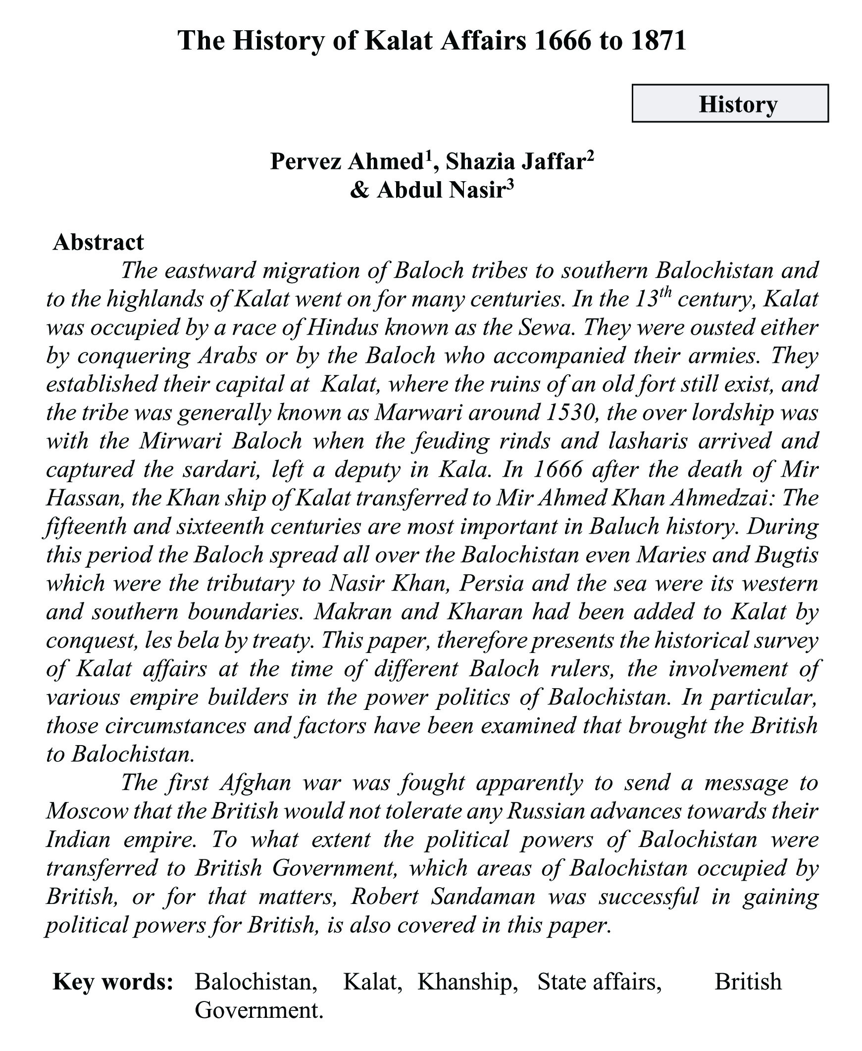 The History of Kalat Affairs 1666 to 1871 (abstract)