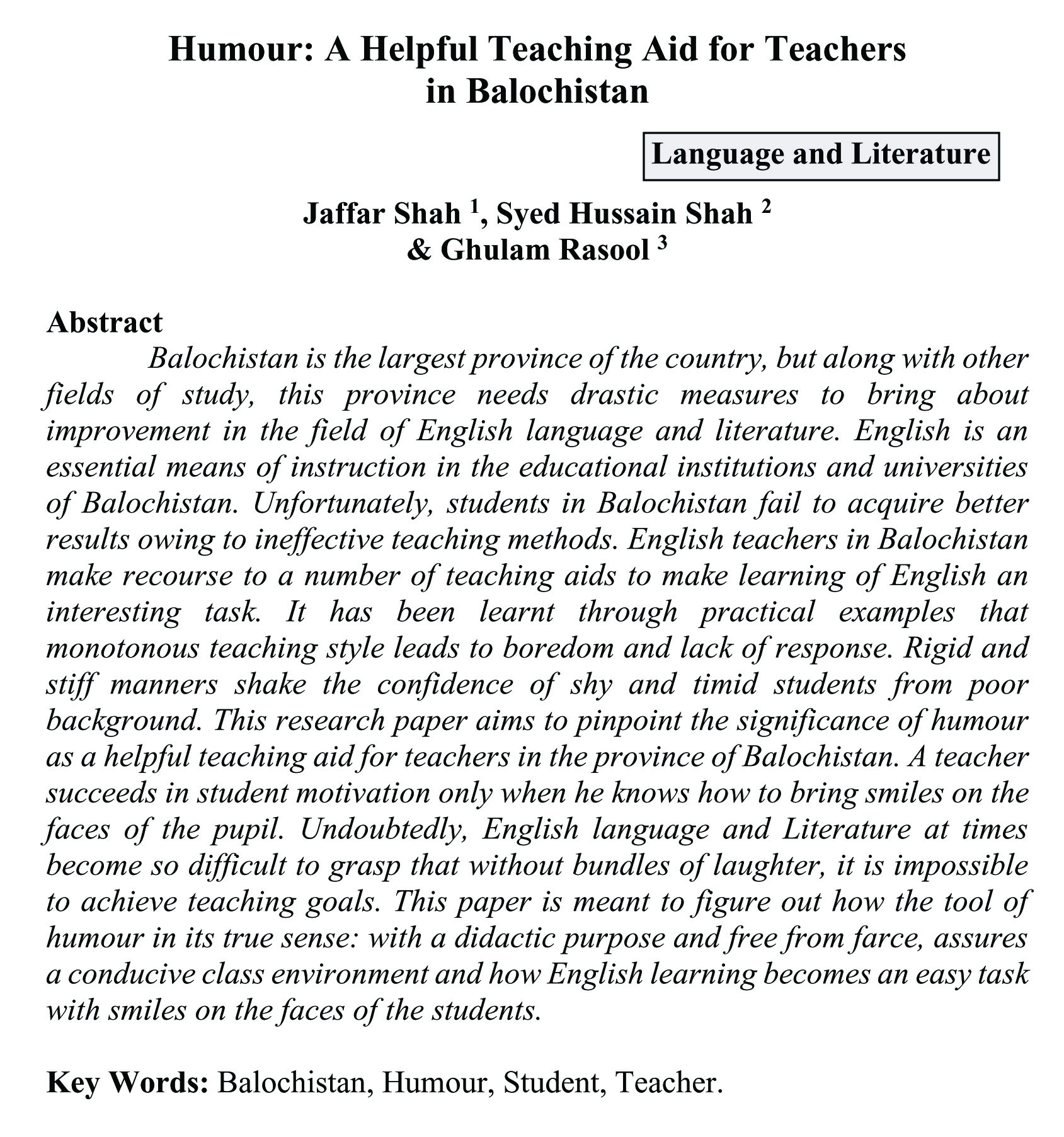 Humour: A Helpful Teaching Aid for Teachers in Balochistan (abstract)