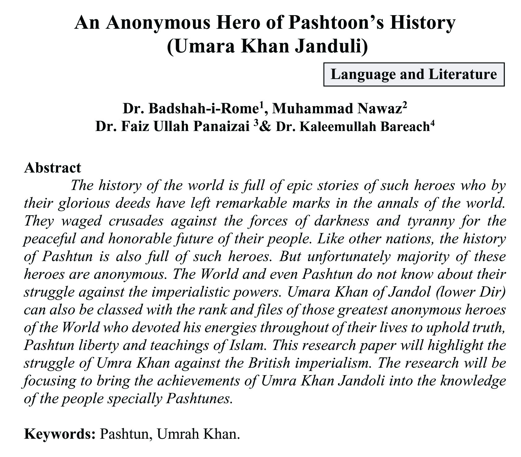 An Anonymous Hero of Pashtoon's History (Umara Khan Janduli) (abstract)
