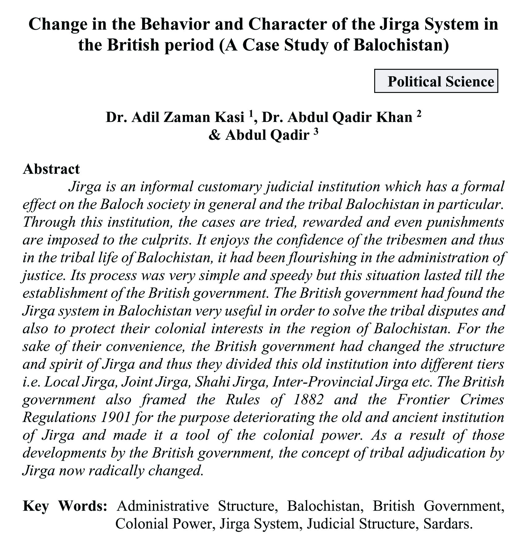Change in the Behavior and Character of the Jirga System in the British period (A Case Study of Balochistan) (abstract)