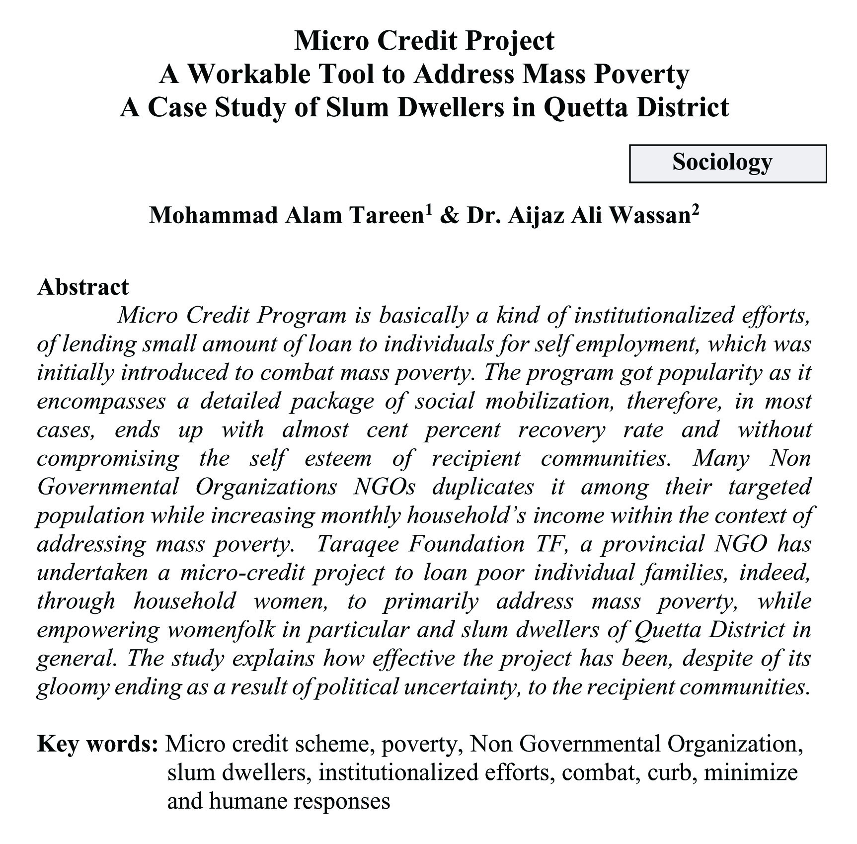 Micro Credit Project A Workable Tool to Address Mass Poverty A Case Study of Slum Dwellers in Quetta District (abstract)