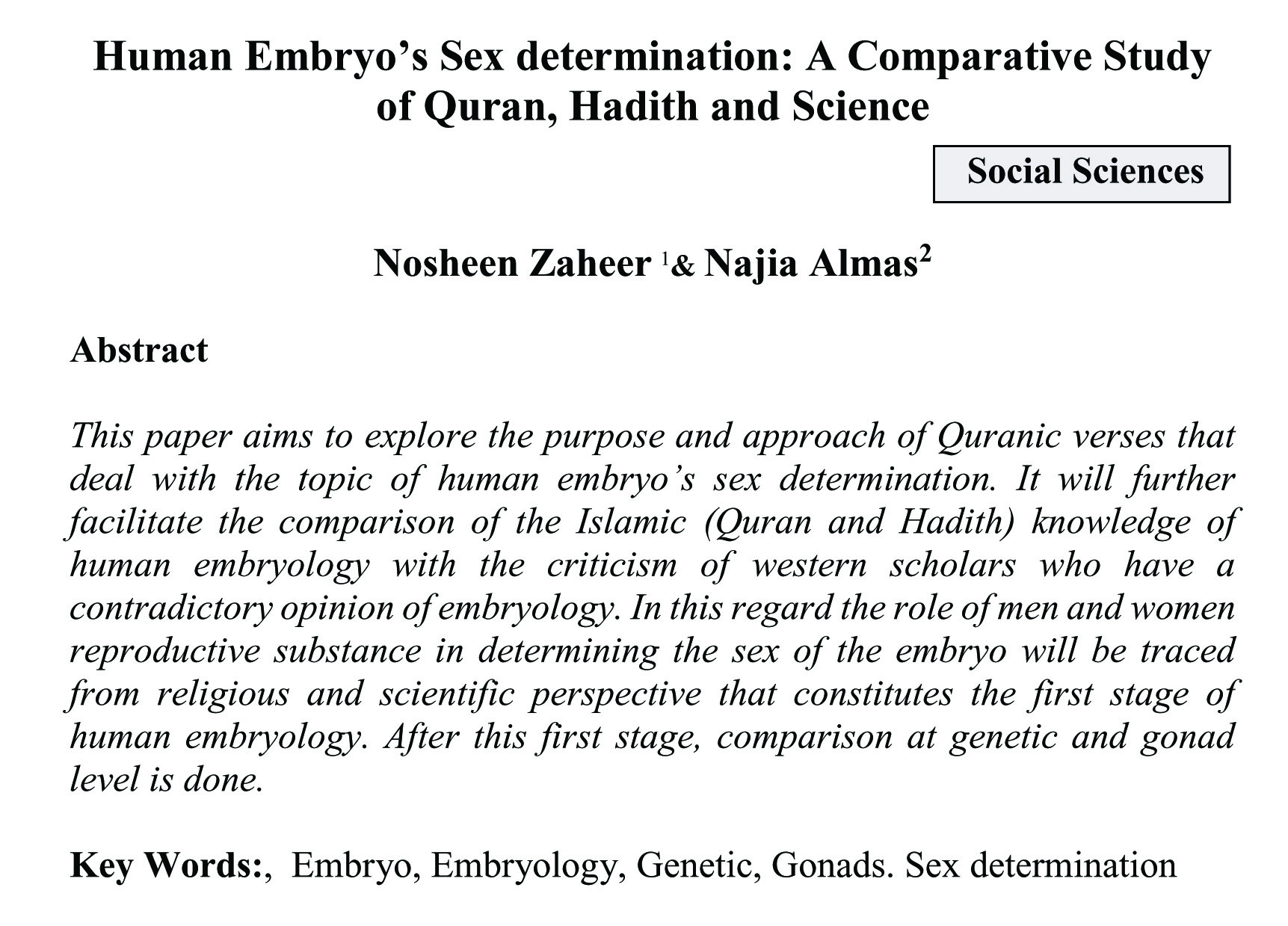Human Embryo's Sex determination: A Comparative Study of Quran, Hadith and Science (abstract)