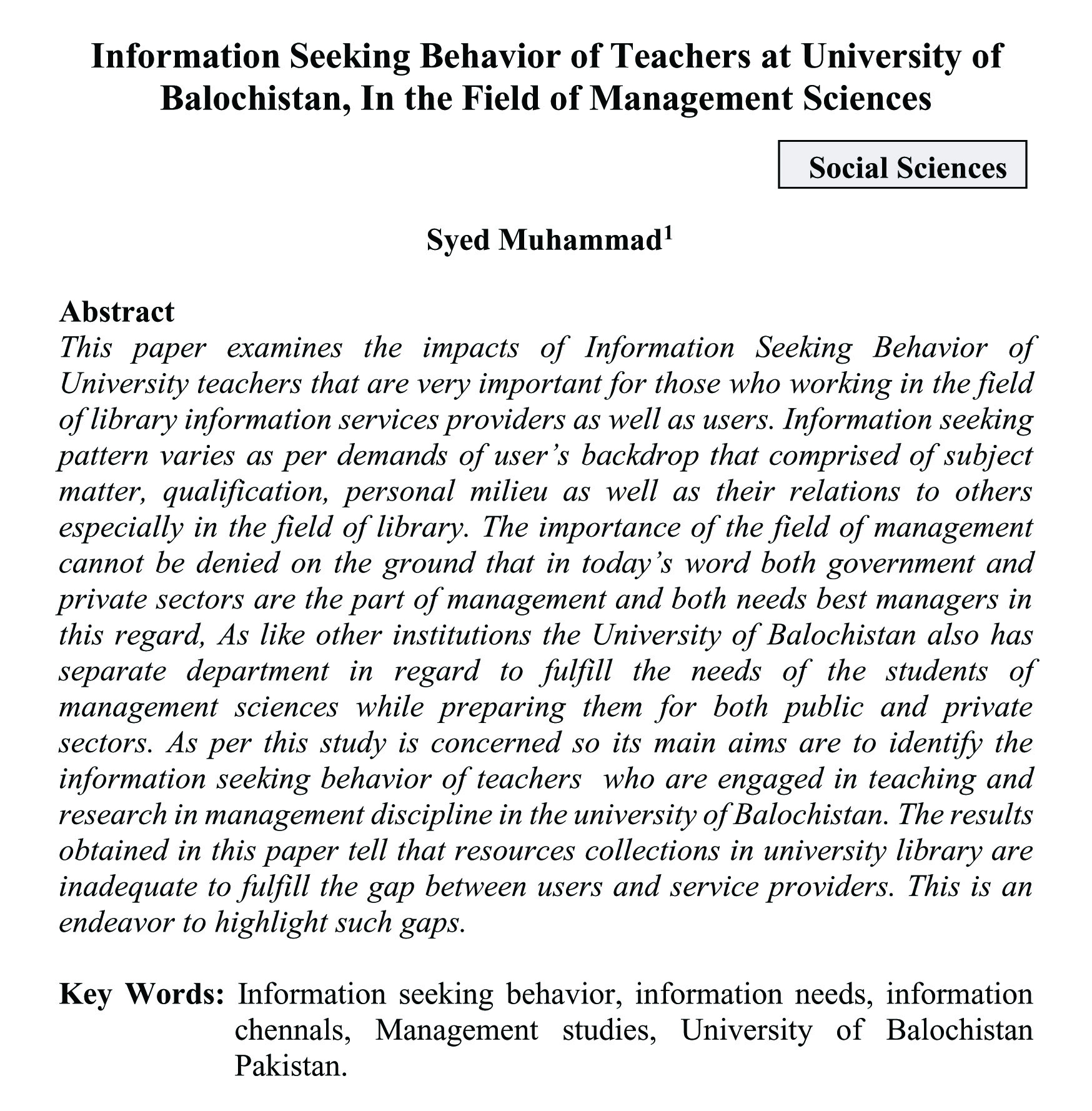 Information Seeking Behavior of Teachers at University of Balochistan, In the Field of Management Sciences (abstract)