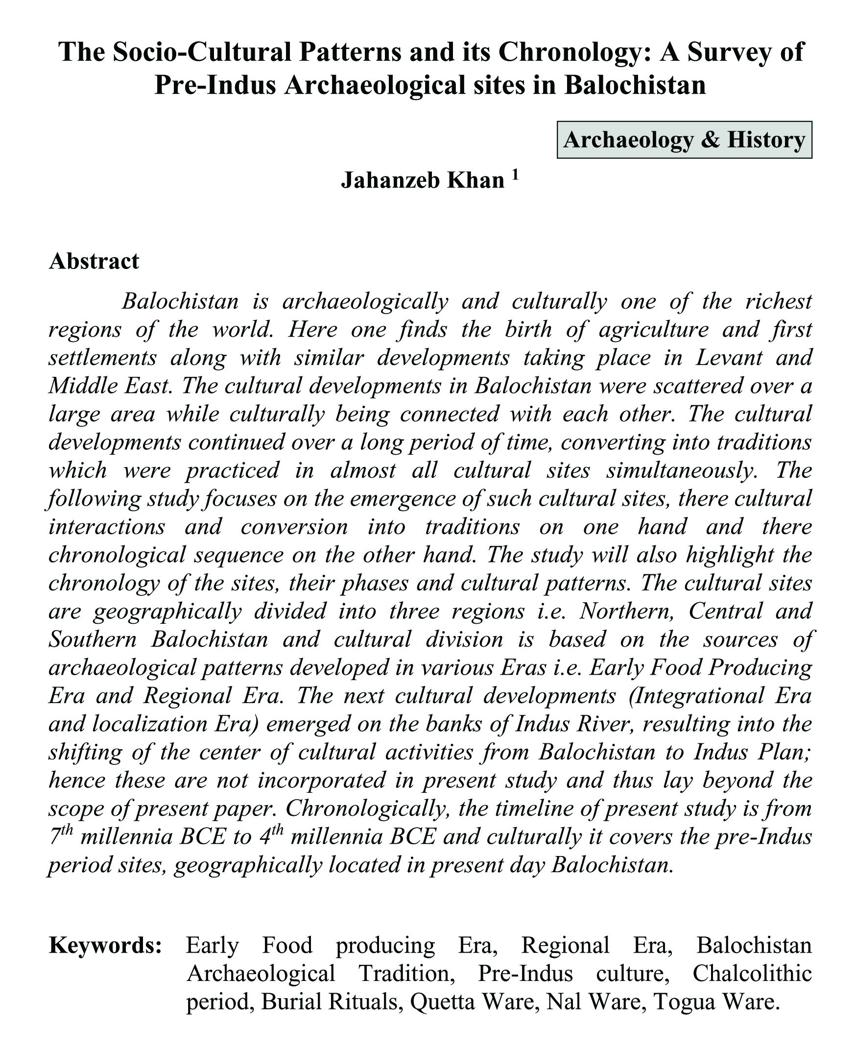 The Socio-Cultural Patterns and its Chronology: A Survey of Pre-Indus Archaeological sites in Balochistan (abstract)