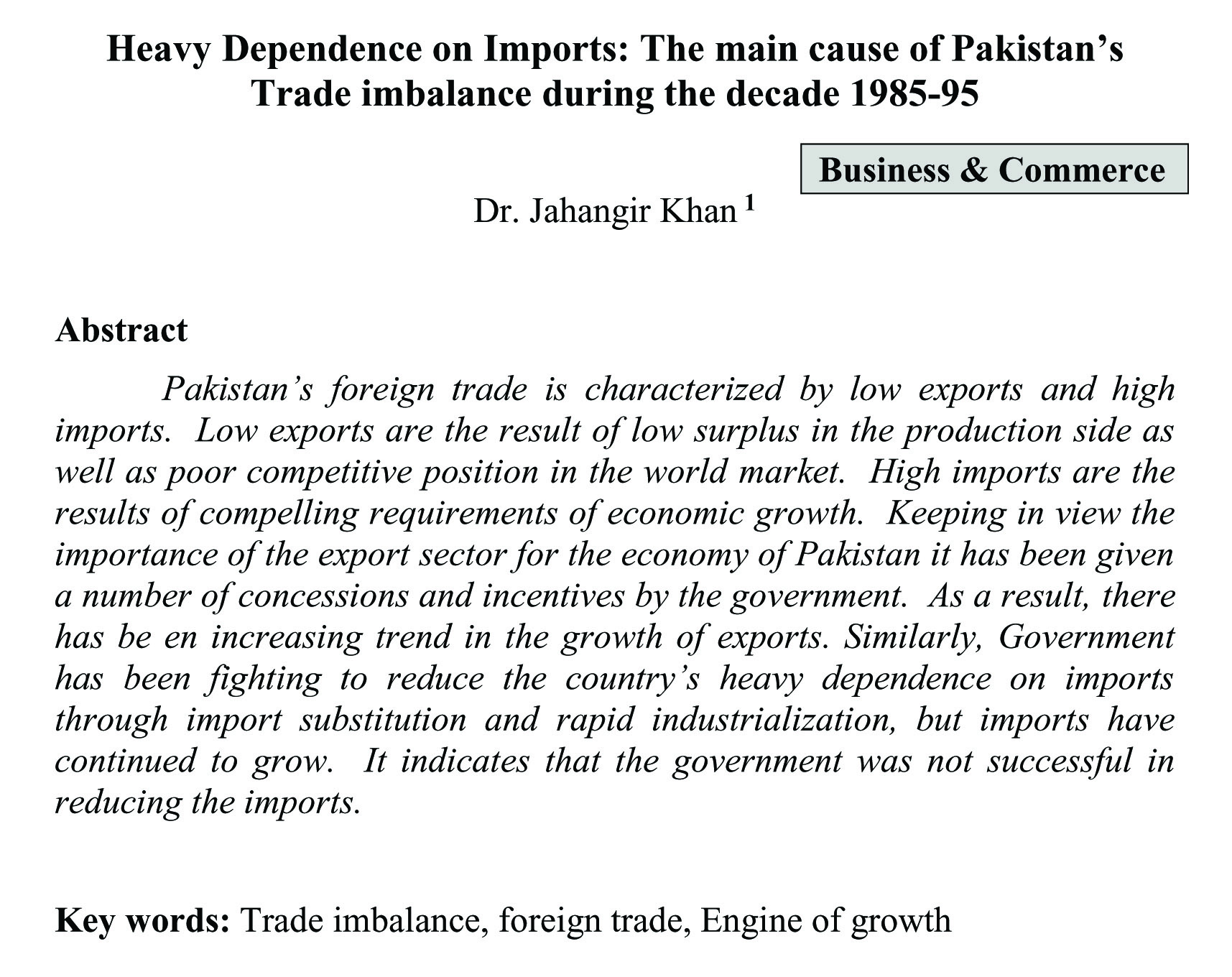 Heavy Dependence on Imports: The main cause of Pakistan's Trade imbalance during the decade 1985-95 (abstract)