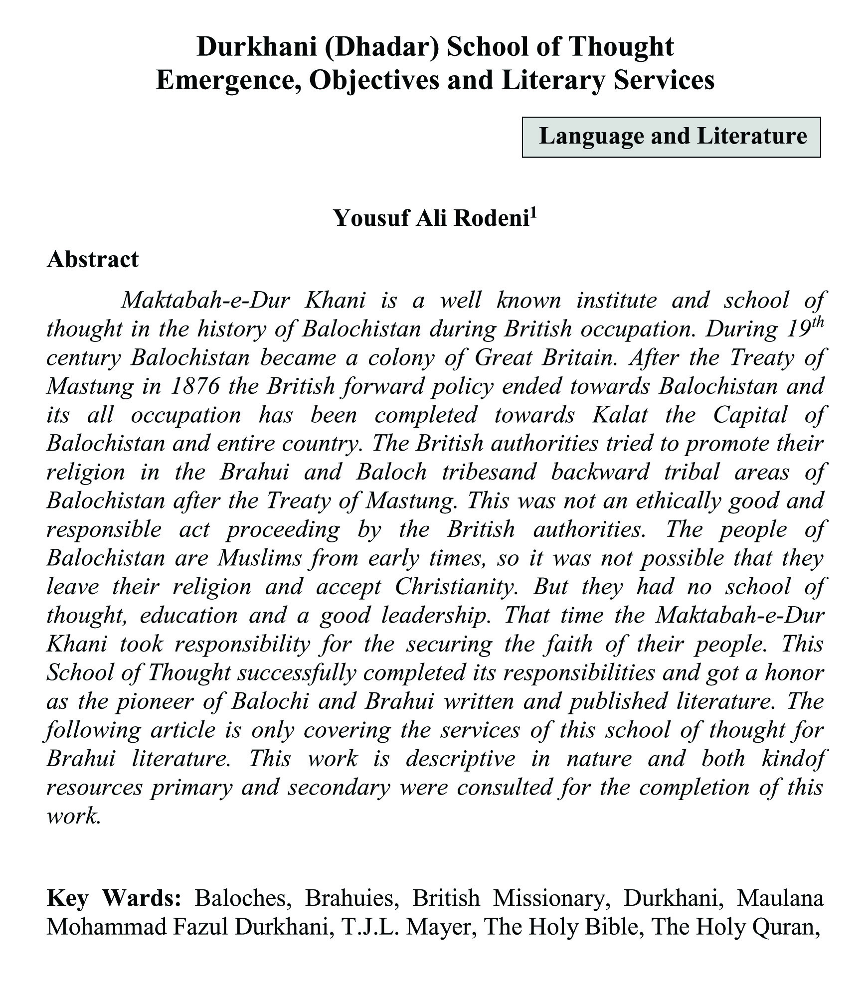 Durkhani (Dhadar) School of Thought Emergence, Objectives and Literary Services (abstract)
