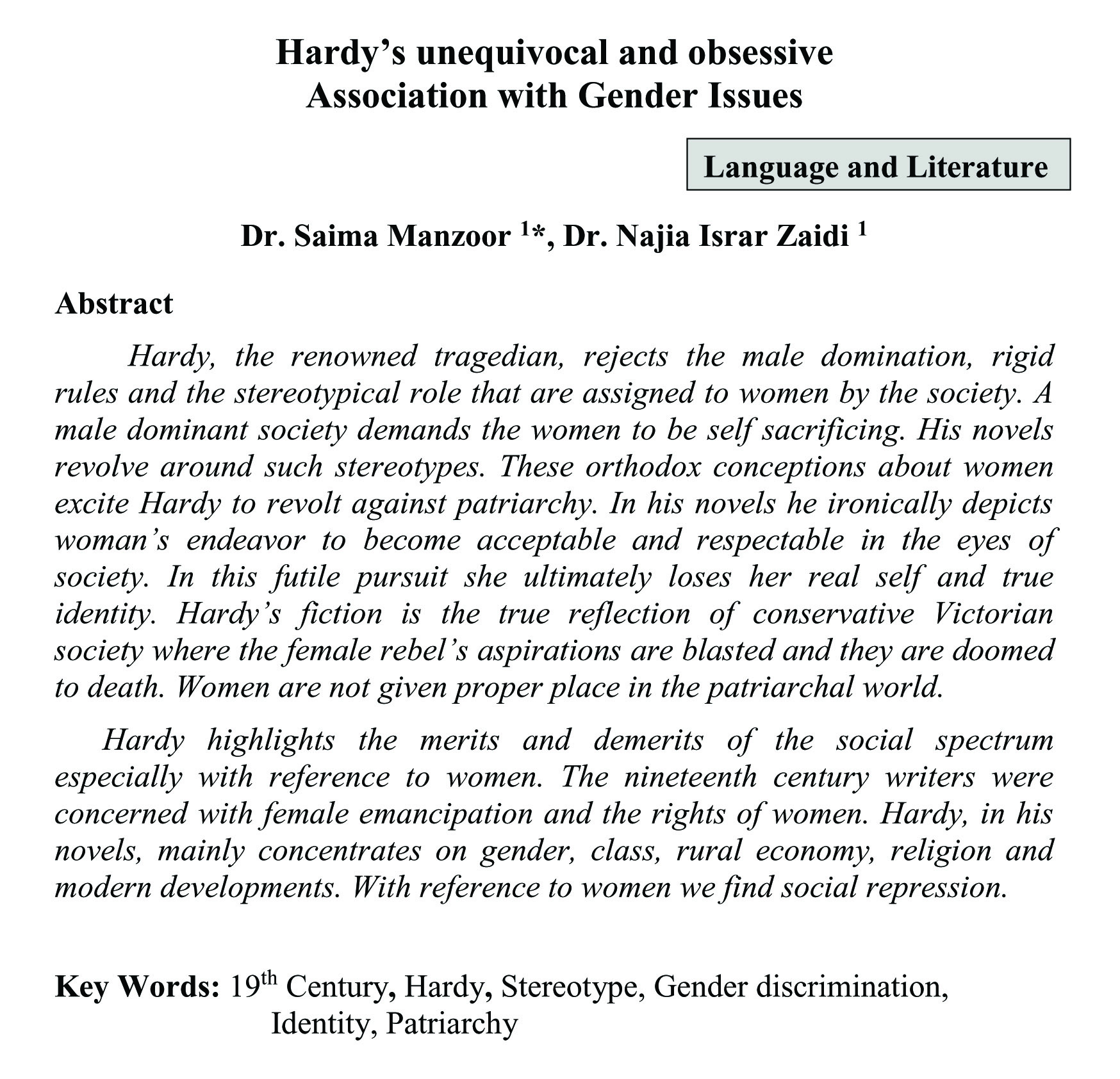 Hardy's unequivocal and obsessive Association with Gender Issues (abstract)