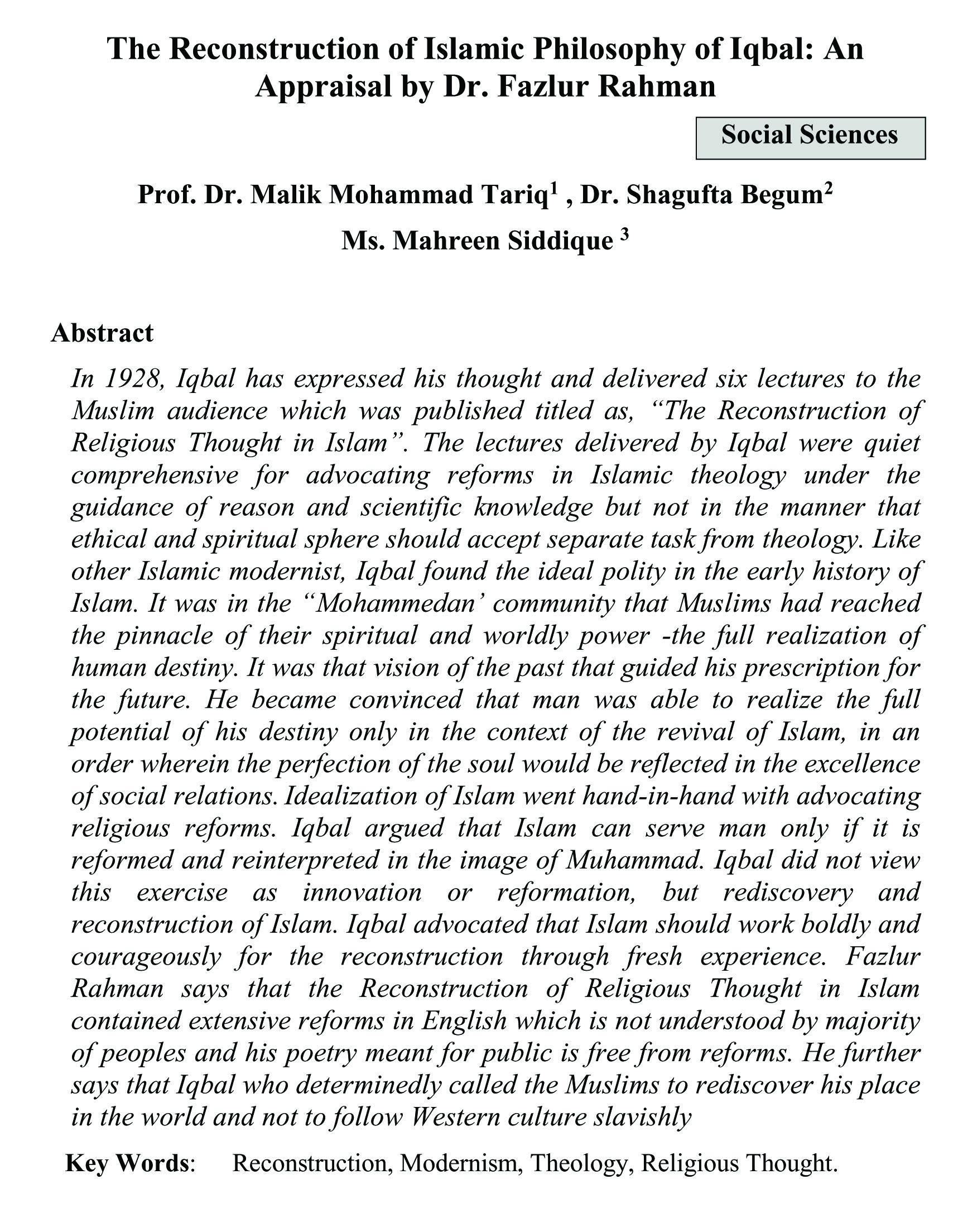 The Reconstruction of Islamic Philosophy of Iqbal: An Appraisal by Dr. Fazlur Rahman (abstract)